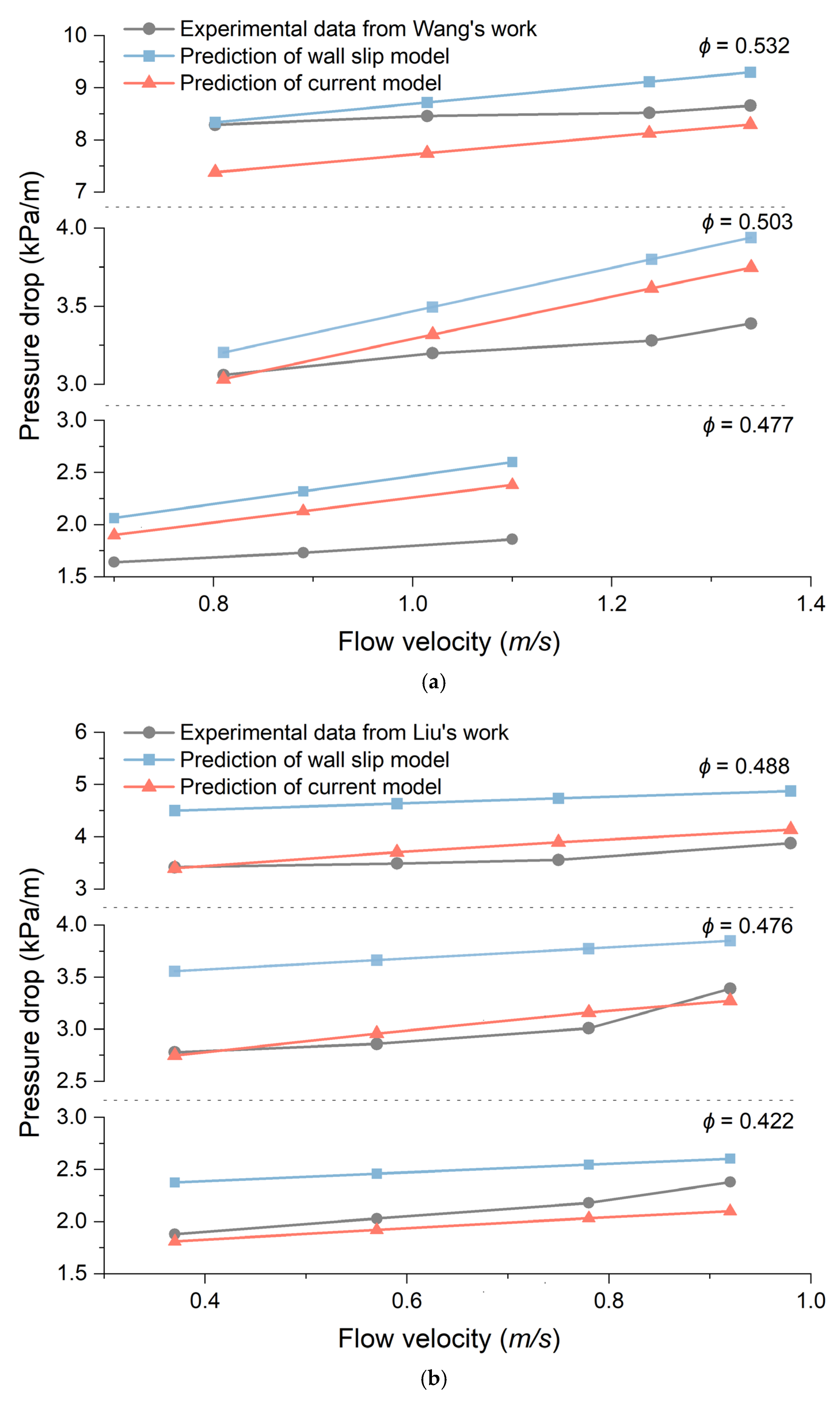 - The prediction of pressure drops of the particle migration-based model outperforms the wall slip model. The prediction error is reduced from approximately 15% to 10% for uncemented tailings slurry, and from 24.3% to 5.3% for cemented tailings slurry.
