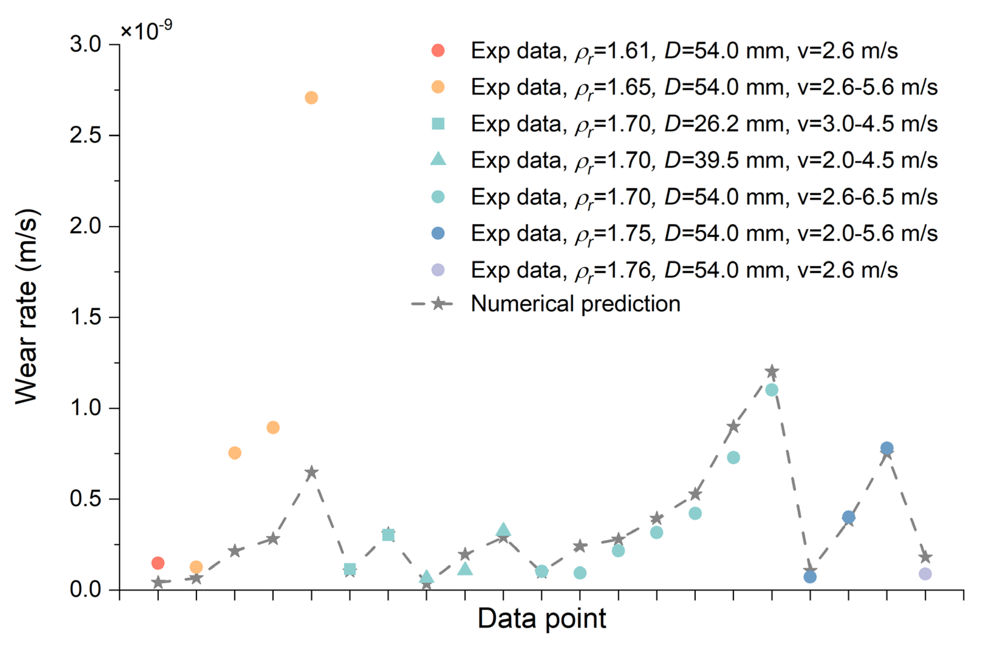 - The prediction of pipe wear rate is in good agreement with the experimental measurement in loop tests. The wear rate of the pipeline for typical backfilling operations is determined to be in the range of 10−10 to 10−9 m/s, which is consistent with field measurements.