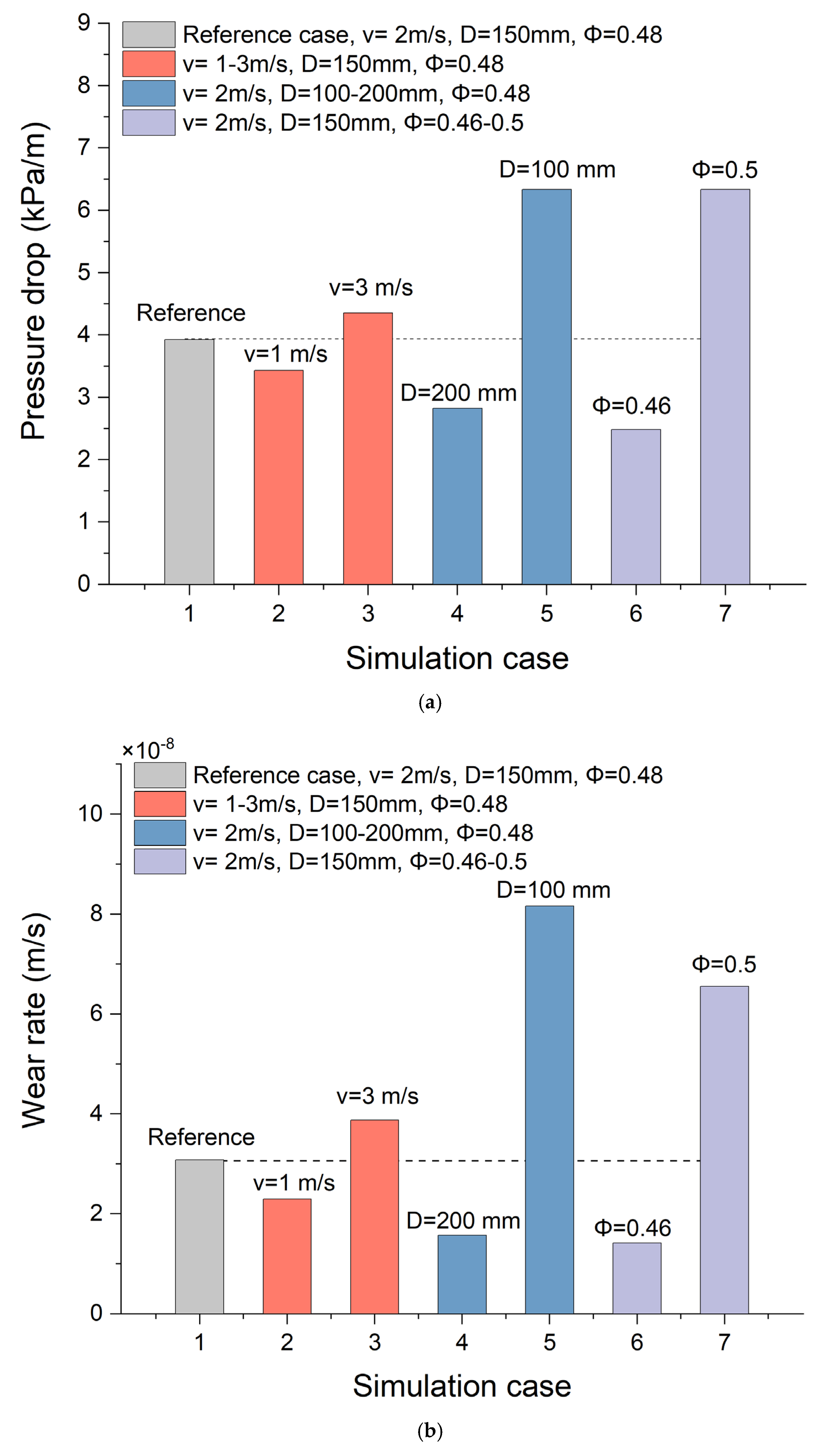 - Both the pressure drop and wear rate increase in the flow with denser solids, higher velocity and smaller pipe diameter. Compared to the velocity, the particle concentration and pipe diameter have a more pronounced or nonlinear effect on the pressure drop and wear rate.