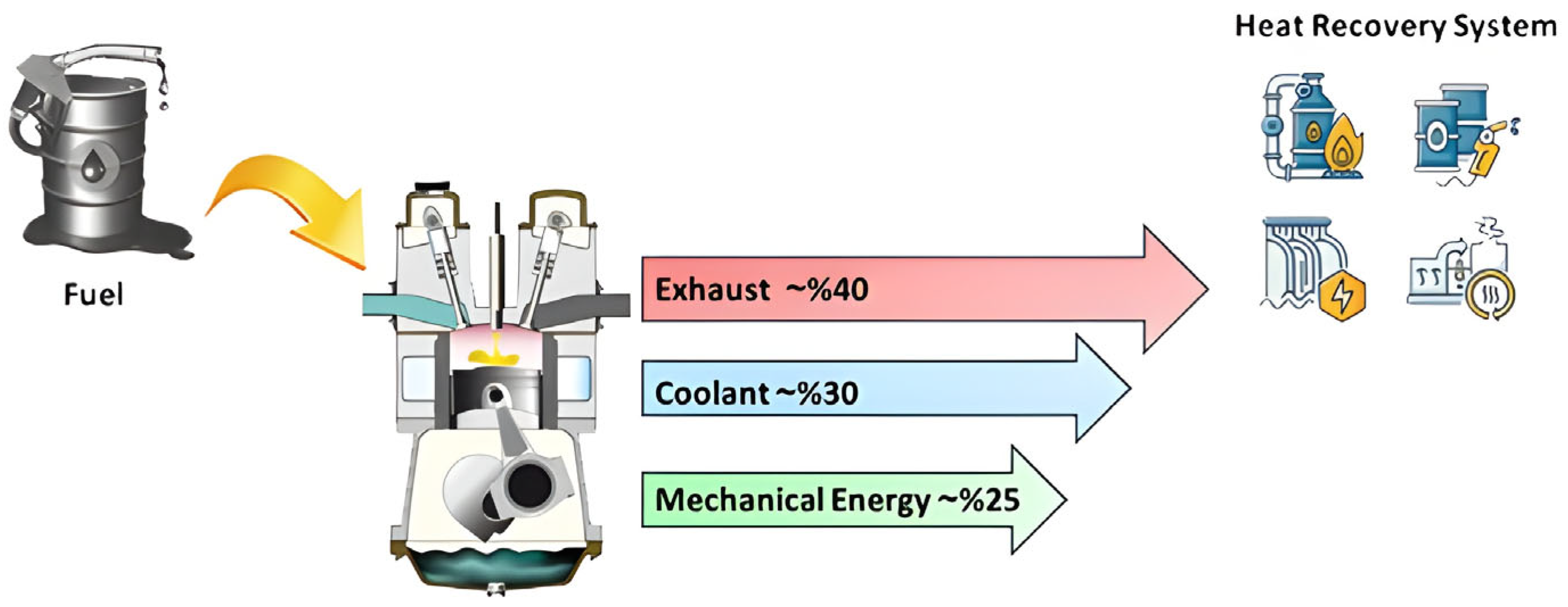 Figure 1, approximately 40% of the fuel energy in internal combustion engines (ICEs) is allocated to exhaust gas, 30% to engine coolant, 5% to radiation and friction, and 25% to vehicle mobility and accessories. This indicates that a substantial portion of the fuel energy, approximately 65% to 70%, is dissipated without being directly utilized. Heat recovery systems are classified into external utilization, serving auxiliary consumers such as heating and air conditioning, and internal recycling, aimed at enhancing engine power, environmental performance, and economic efficiency [