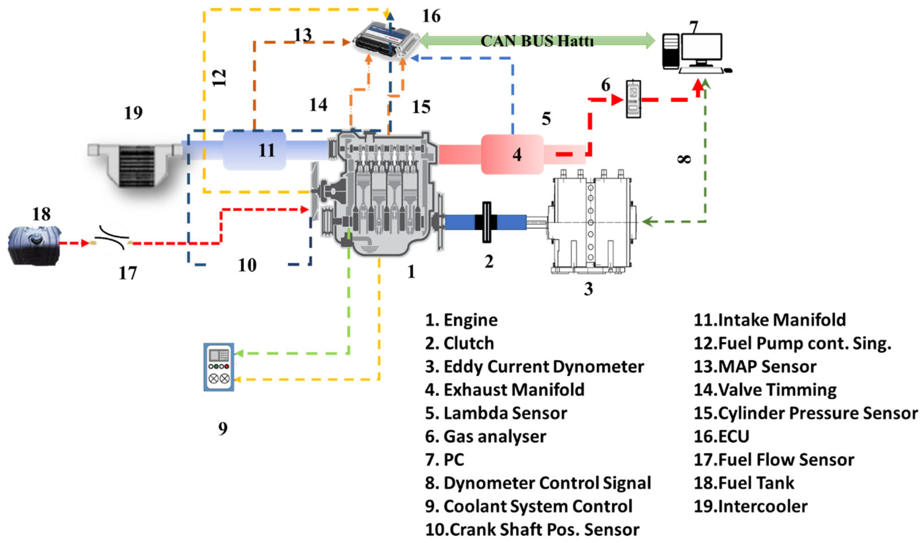 The experiments were carried out in the Engine Excellence laboratories in Gebze, Kocaeli at the Scientific and Technical Research Council of Türkiye—Institute of Rail Transportation Technologies (TÜBİTAK-RUTE). A schematic view of the test setup, in which the experiments were conducted and different operating parameters were measured, is presented in