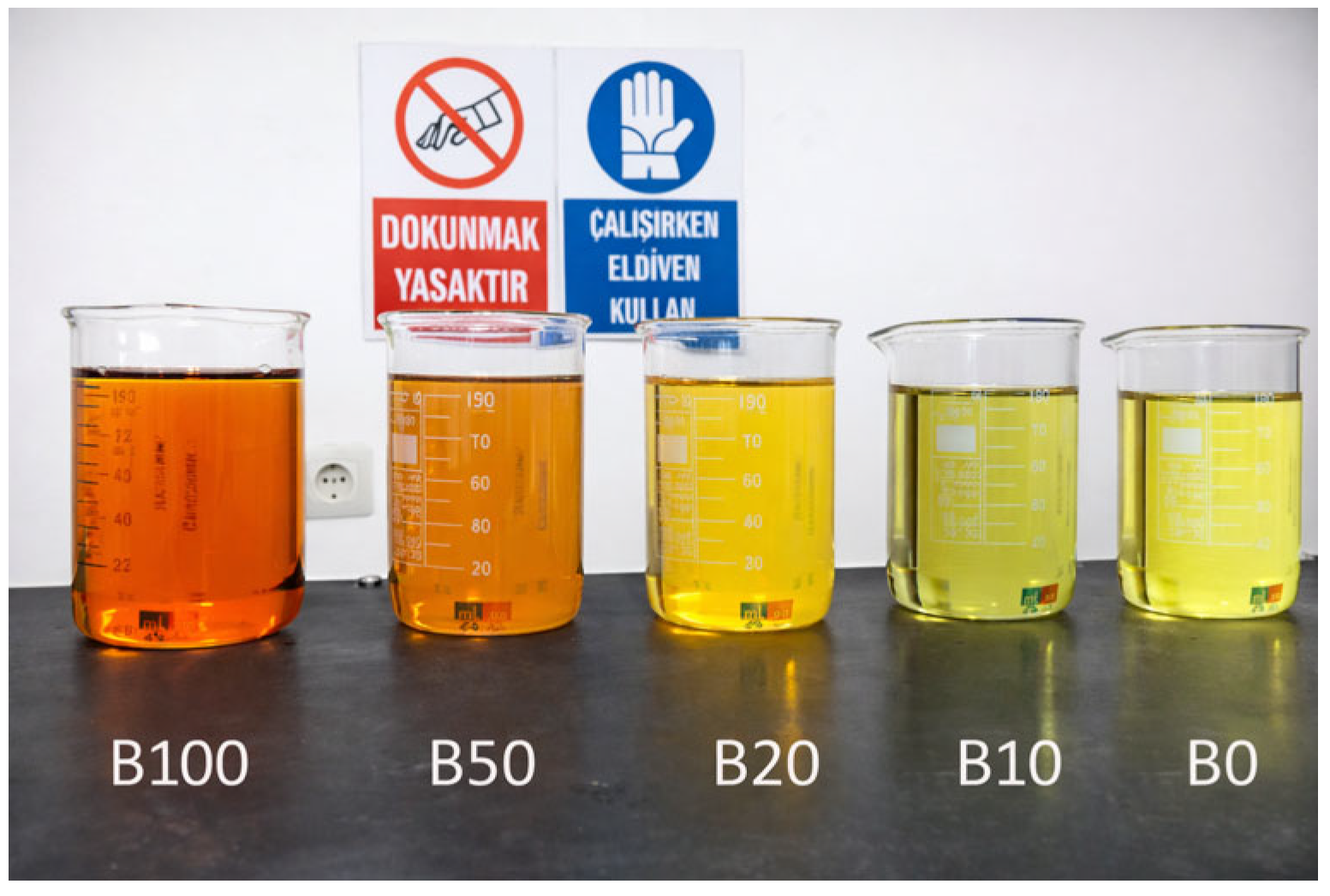 For the fuel mixtures used in the experimental study, plant-based biodiesel was purchased from the market. Biodiesel was mixed with diesel fuel at 0%, 10%, 20%, 50% and 100% by volume. Five types of fuel were used in the experiments: B0 (diesel), B10, B20, B50, and B100 (biodiesel).
