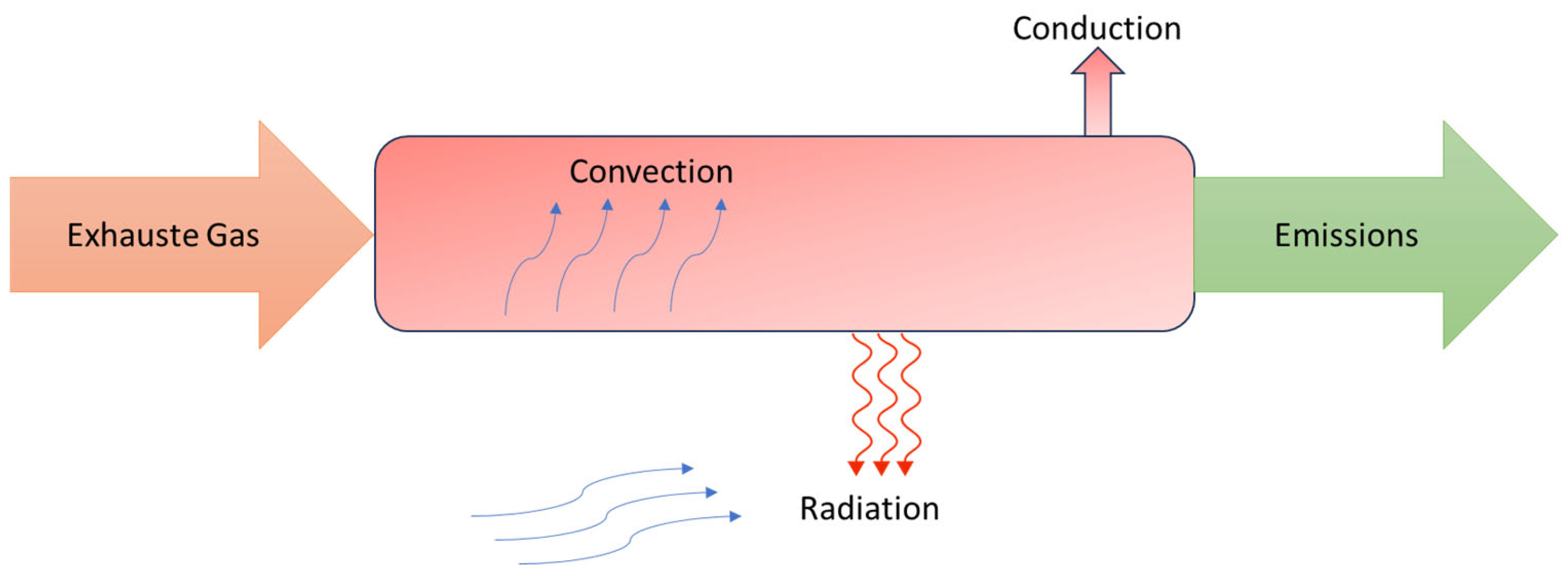 Heat transfer in the exhaust system plays a pivotal role in the TEG system. Following the combustion of the fuel utilized in ICEs, the end combustion gases are expelled through the exhaust system under the influence of high temperatures and pressures. During the exhaust of the exhaust gas, heat transfer occurs from both the environment and the exhaust system. The mechanism of heat transfer in the exhaust system is illustrated in