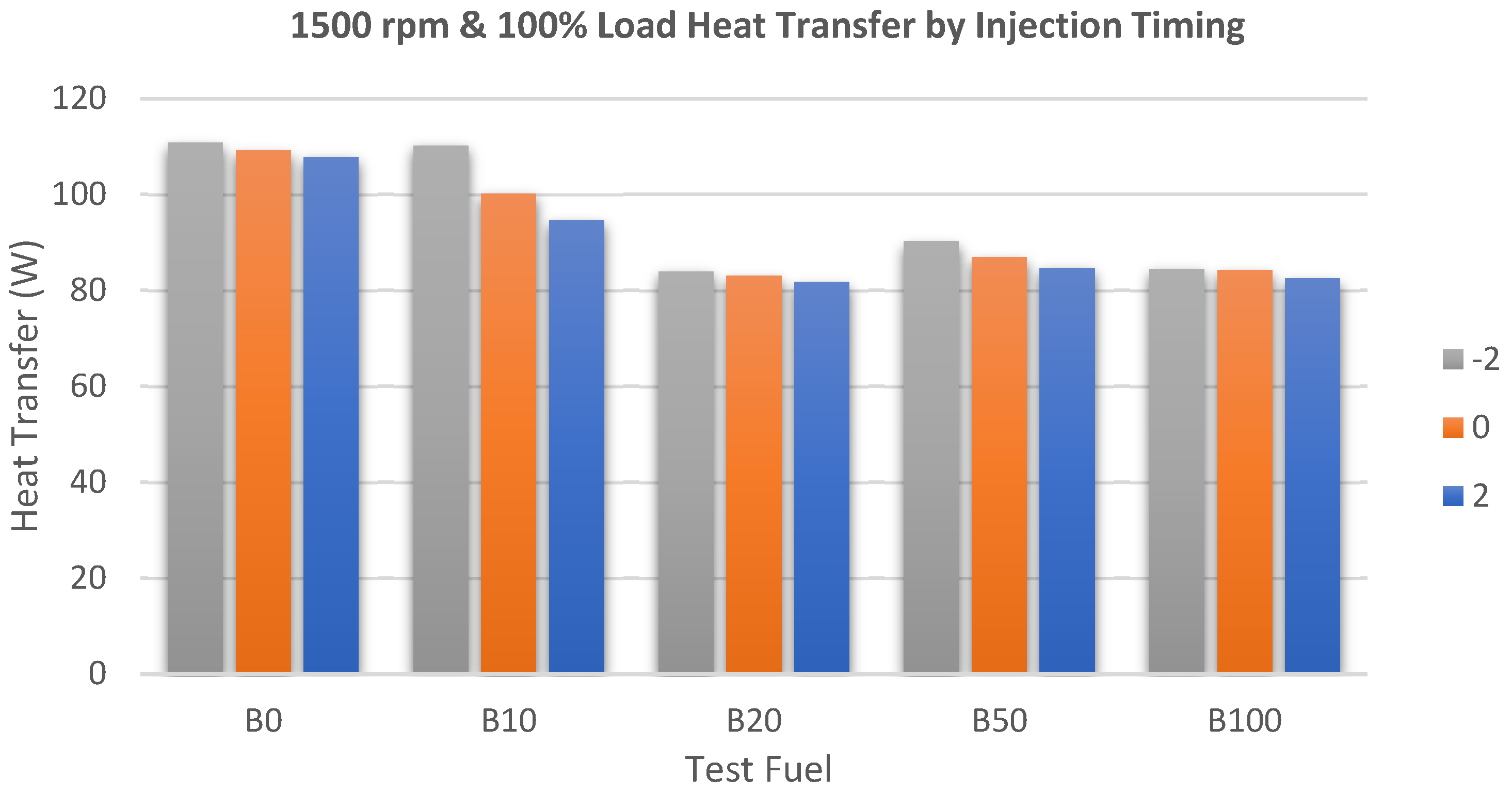 Figure 8 shows the heat transfer amount of the test fuels depending on the injection timing at 1500 RPM and 100% engine load. Analysis of the graph indicates that the amount of heat transfer decreases with an increase in the biodiesel ratio in the fuel mixtures.
