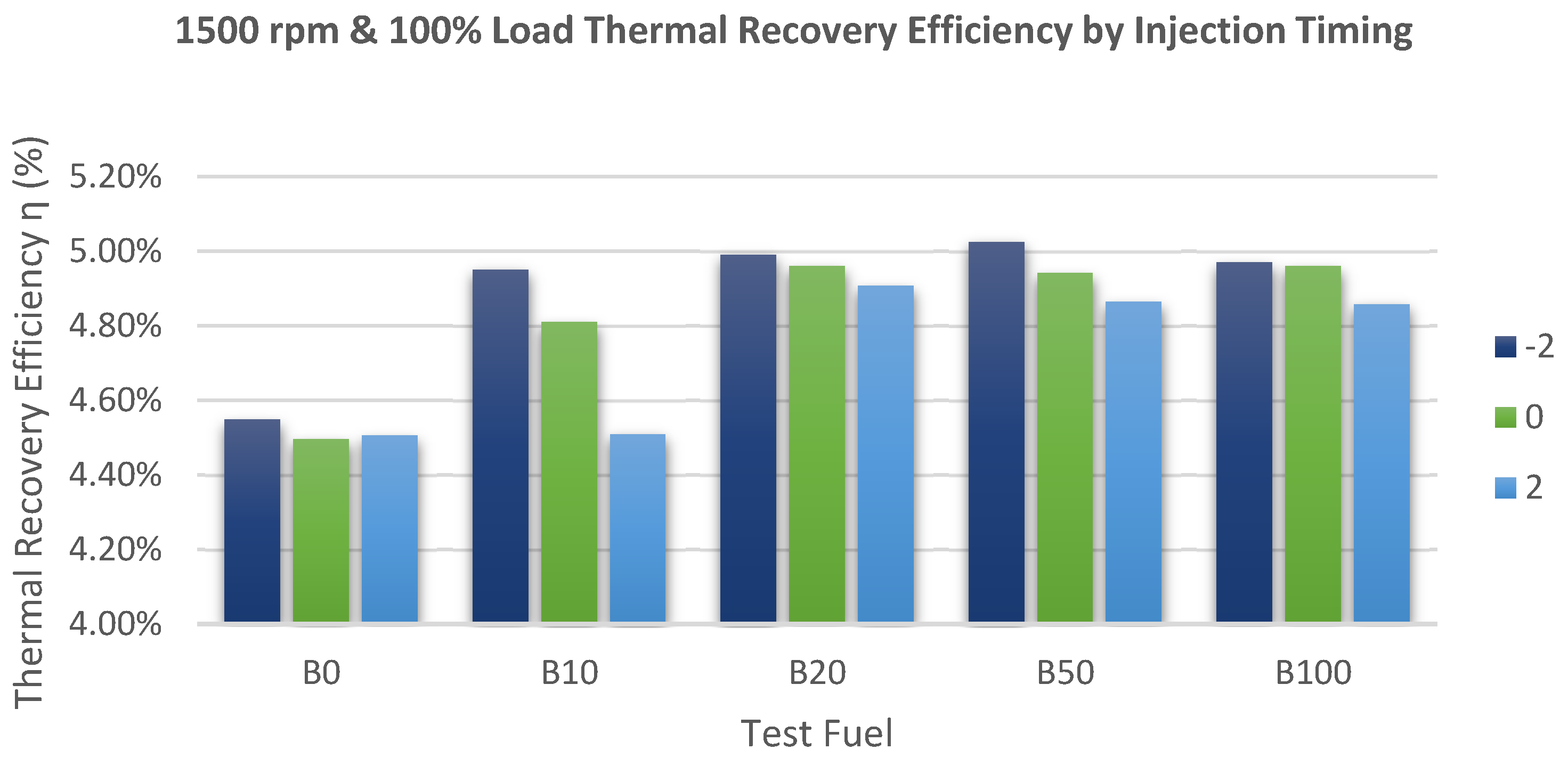 Figure 8. Increasing injection timing, that is, injecting the fuel earlier (−2 °CA), generally leads to higher heat recovery efficiency values for all test fuels. For instance, for B0 fuel, the heat recovery efficiencies were measured as 4.55% at −2 °CA, 4.50% at 0 °CA, and 4.51% at +2 °CA. A similar trend was observed for B50 fuel, with the injection timing values yielding 5.02%, 4.94%, and 4.87%, respectively.