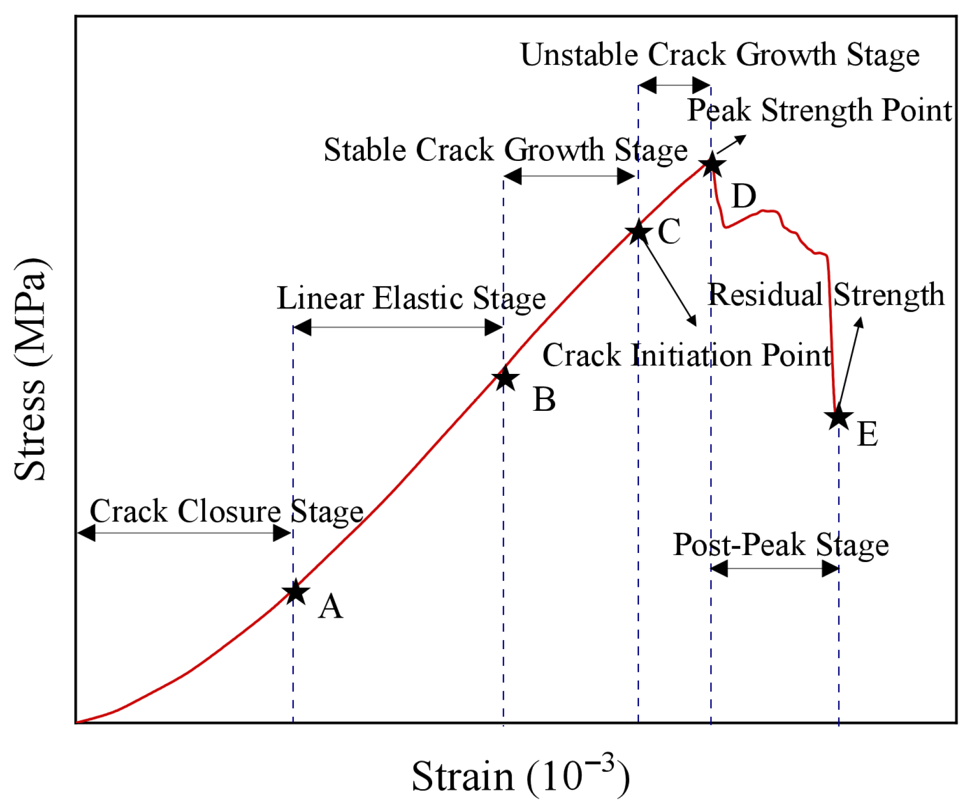 - Macroscopic Mechanical Response: All specimens underwent initial compaction, elastic deformation, and stable crack propagation. Post-peak behavior varied distinctly: coal–rock showed gradual strength degradation, mudstone exhibited a sharper strength drop yet higher residual capacity, and horizontally fractured sandstone displayed “serrated” fluctuations, reflecting significant material mismatch effects.