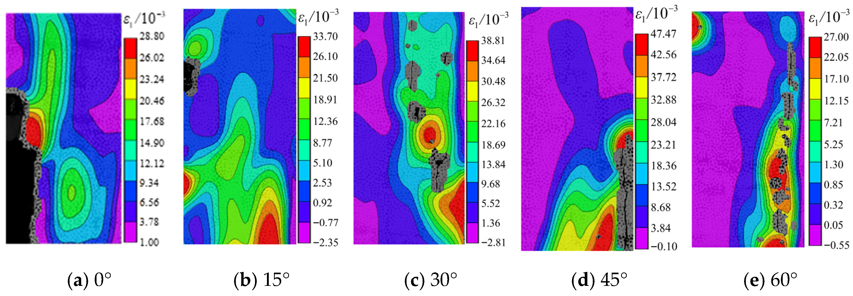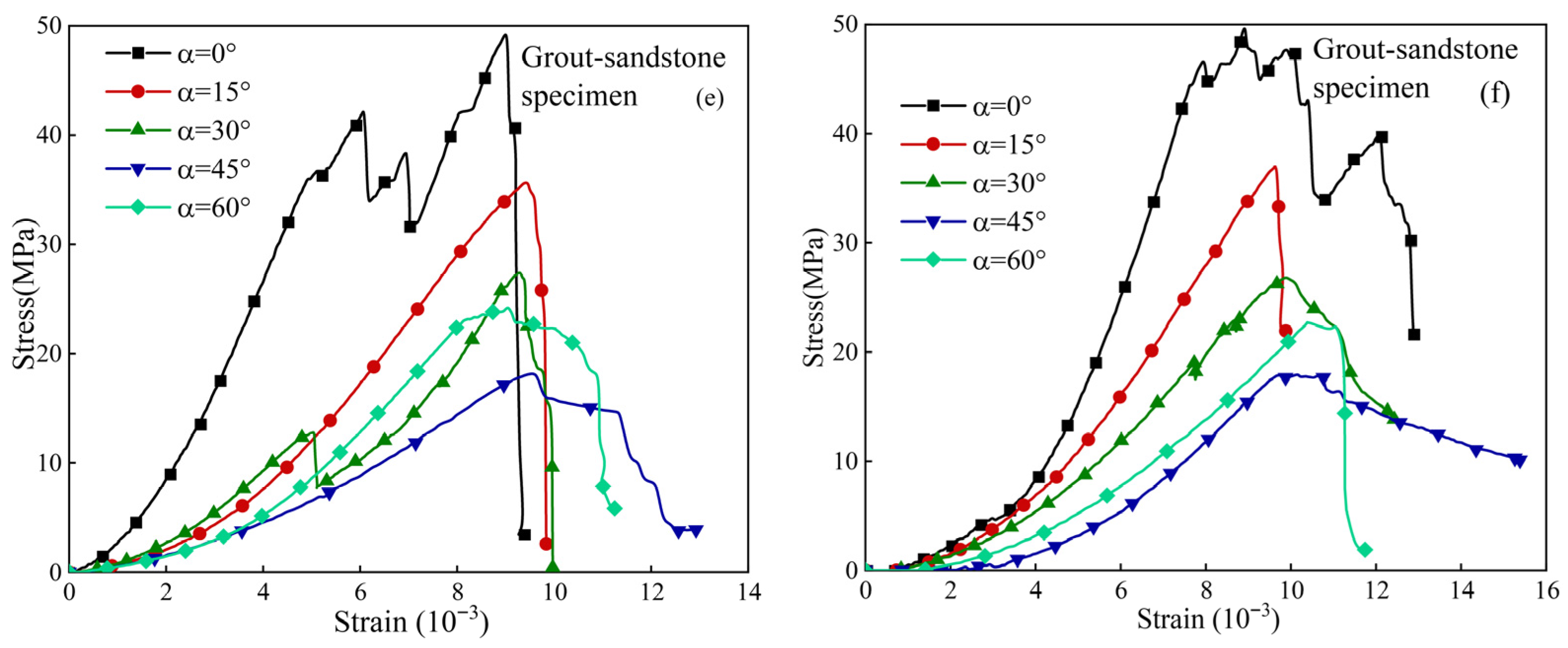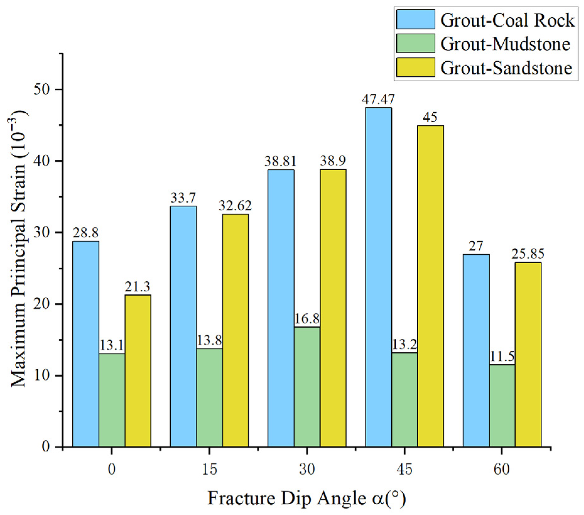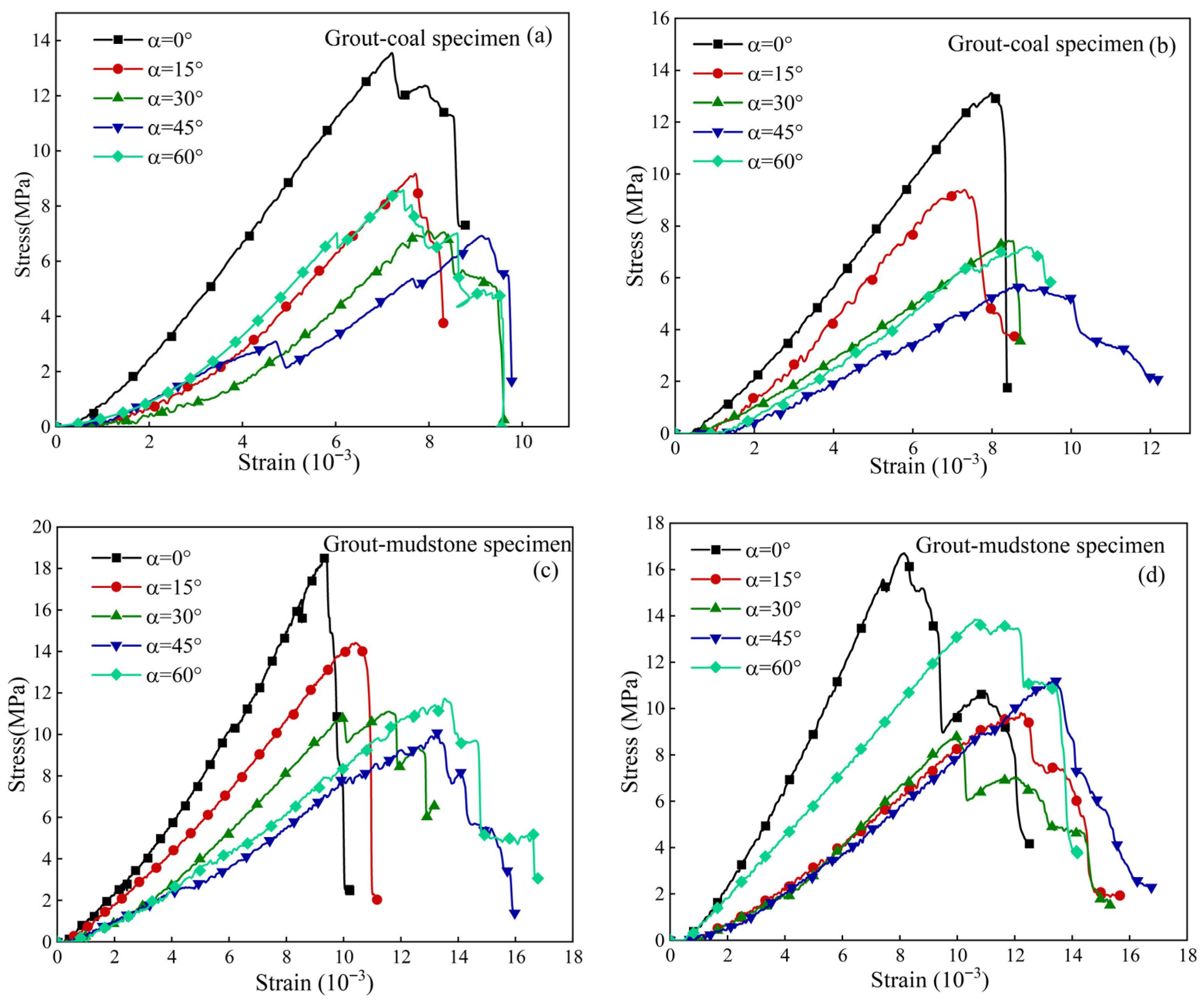 - Strain Evolution Process: For 0° and 60° fractures, crack initiation occurred mainly before peak stress, while rapid propagation and coalescence developed post-peak. The maximum principal strain first increased and then decreased with rising inclination, with grout–mudstone specimens consistently showing the lowest values.