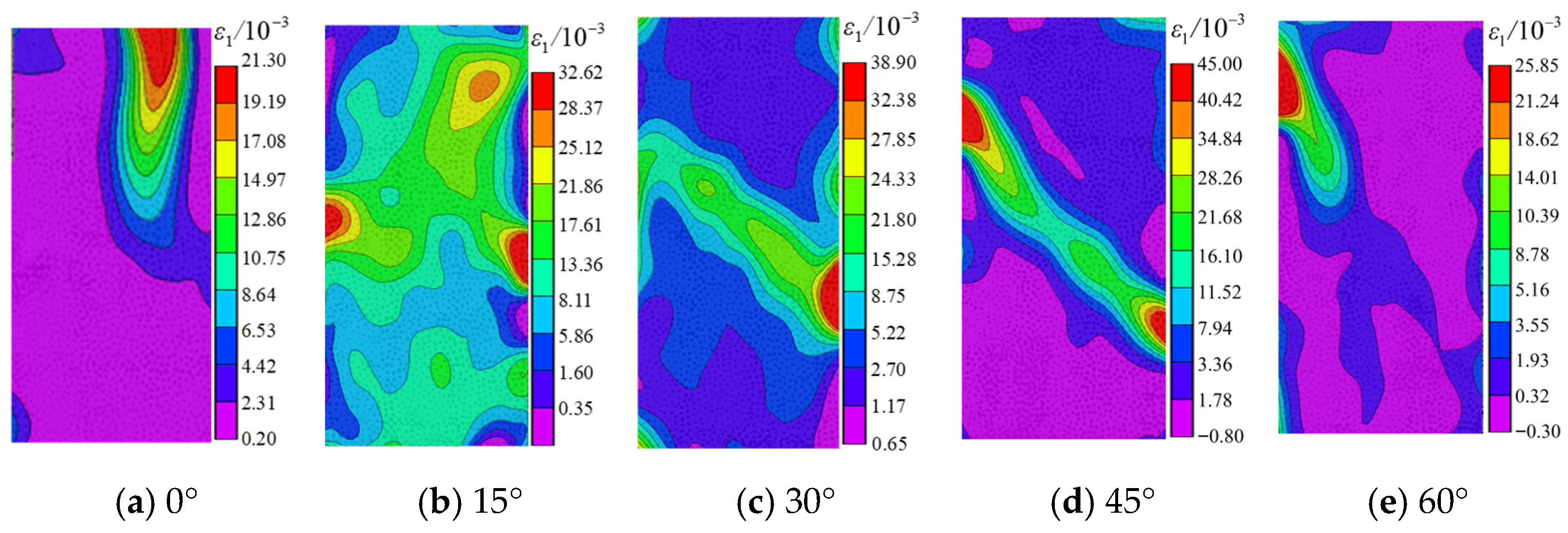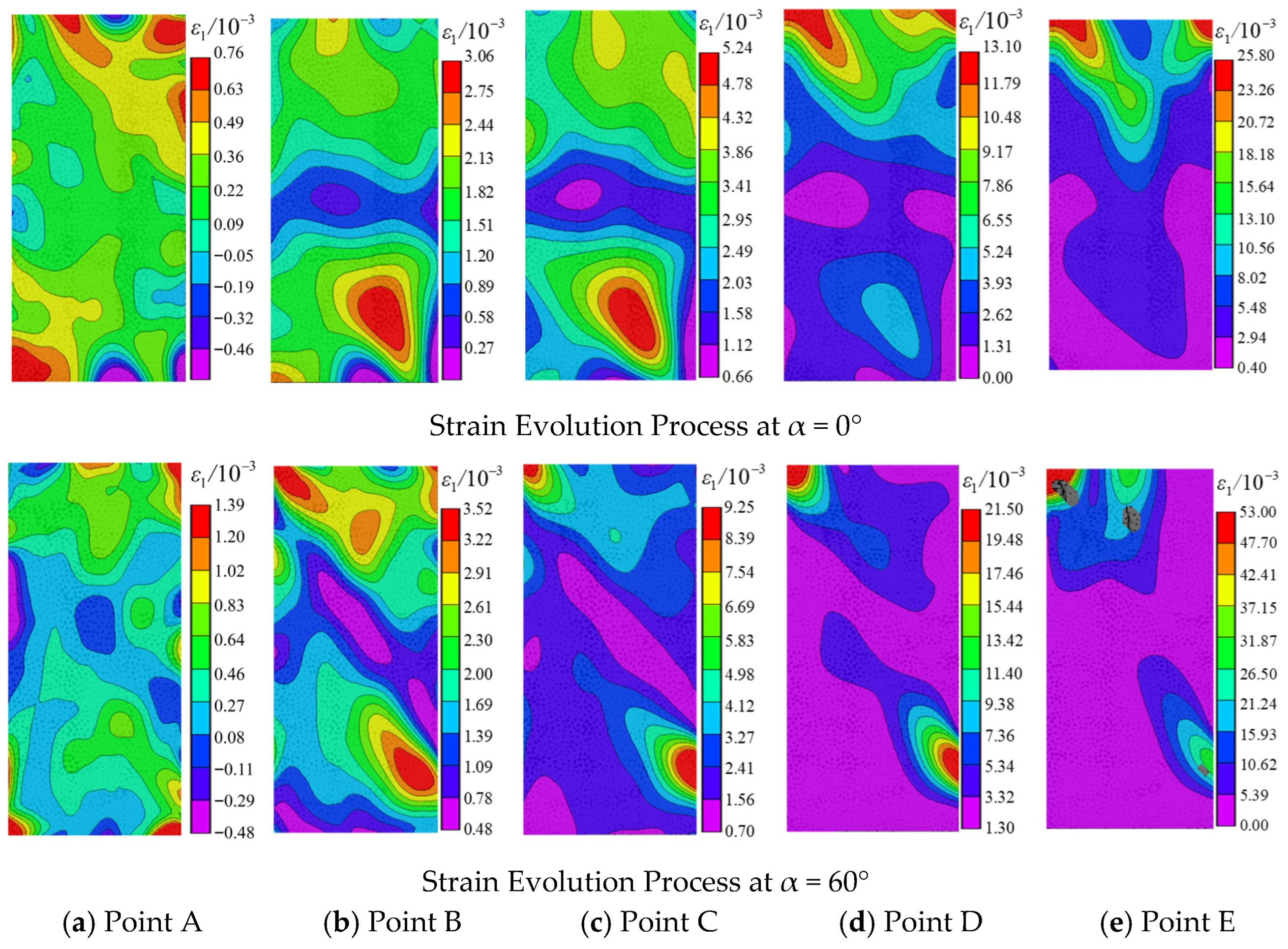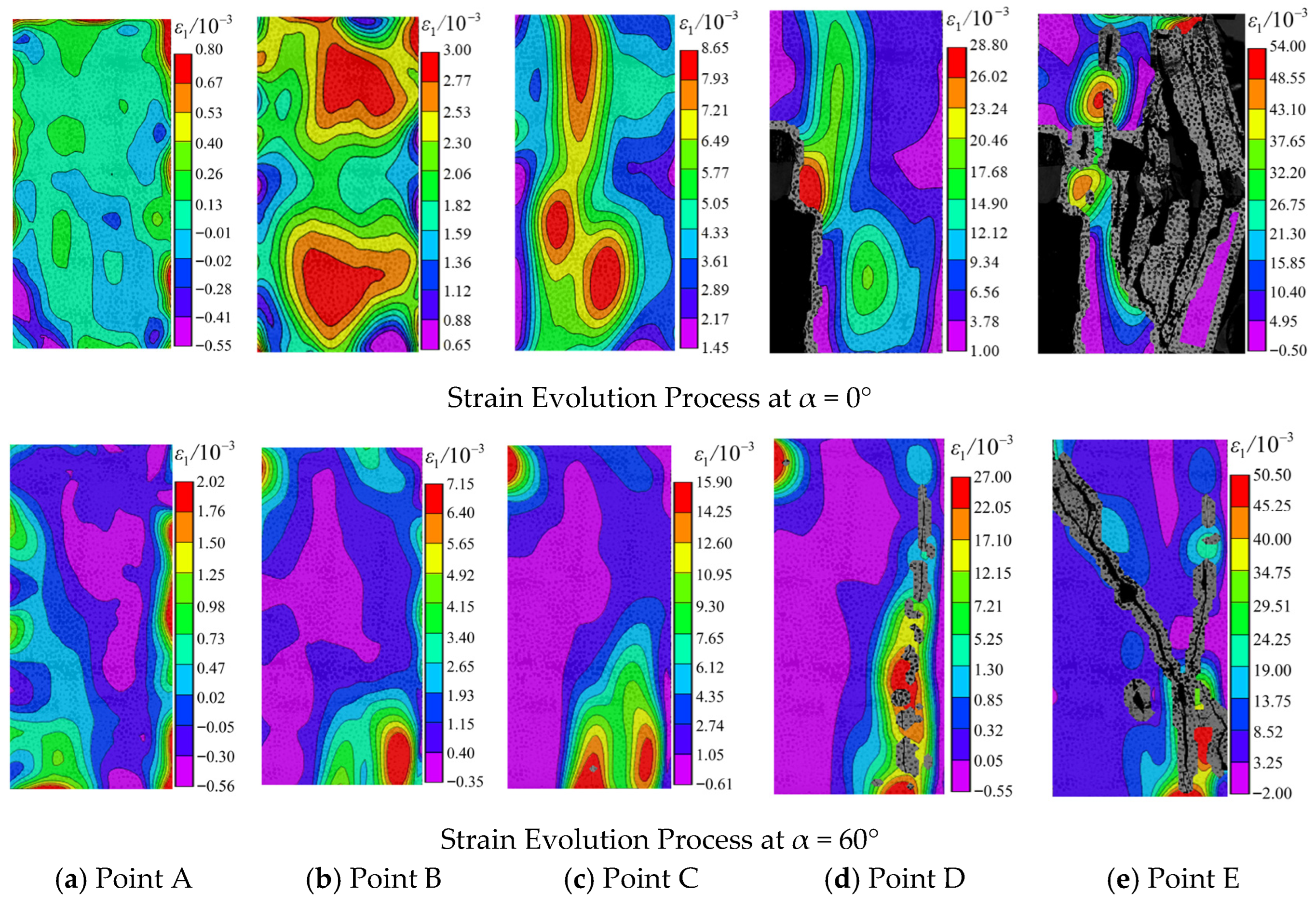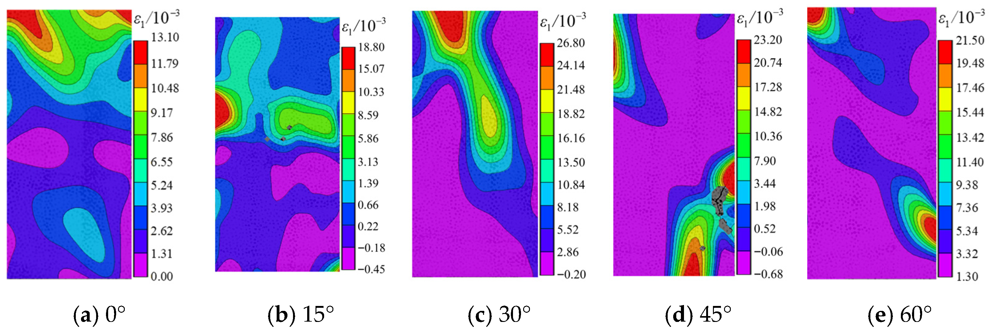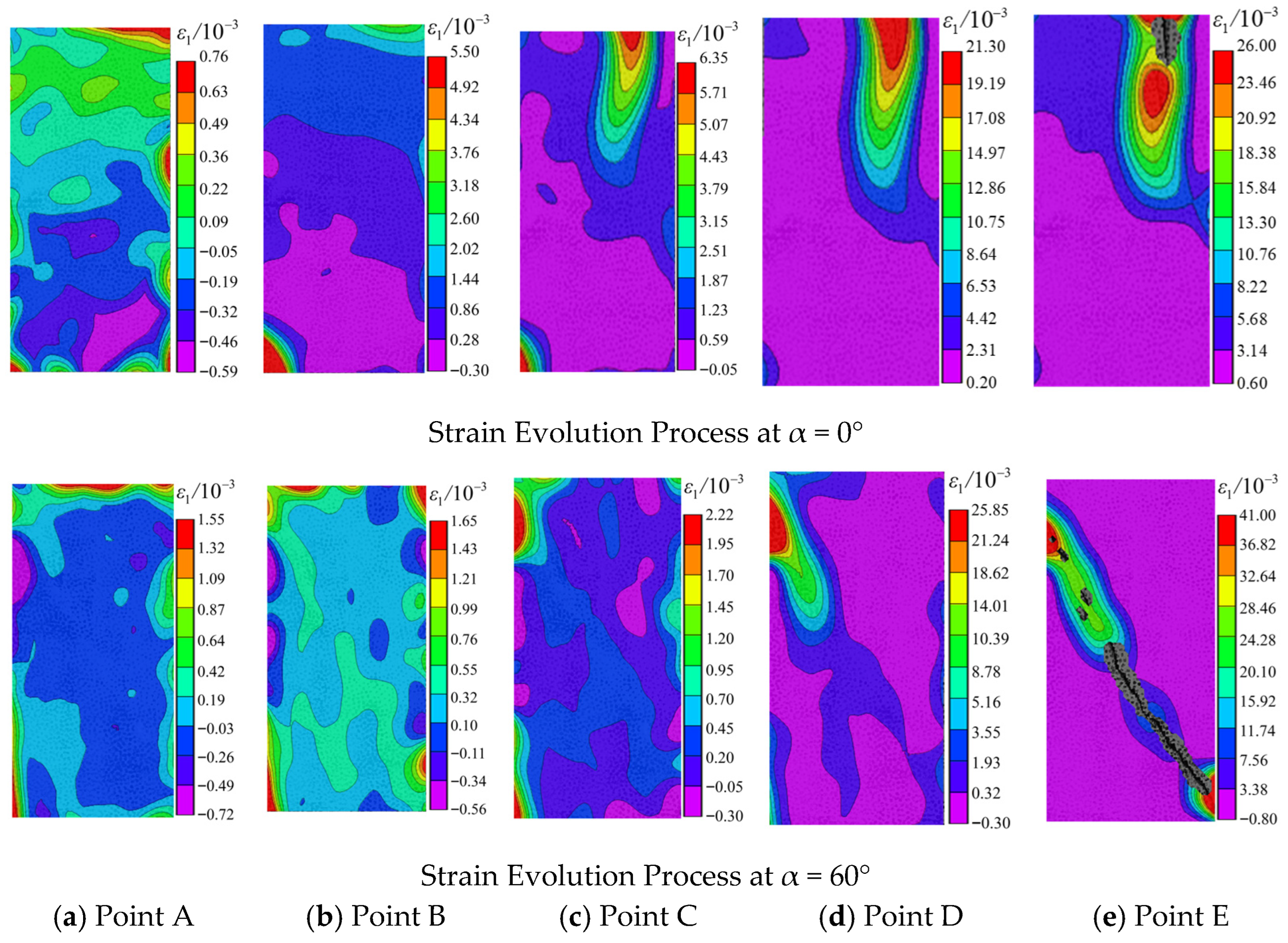 - Strain Evolution Process: For 0° and 60° fractures, crack initiation occurred mainly before peak stress, while rapid propagation and coalescence developed post-peak. The maximum principal strain first increased and then decreased with rising inclination, with grout–mudstone specimens consistently showing the lowest values.