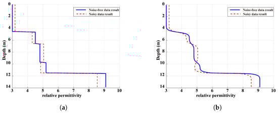 The smoothed results are presented in Figure 8b (blue solid line), which demonstrates that key features (e.g., inflection points and layer interfaces) are well retained, making the model more compatible with the gradual variation characteristics of subsurface media. To further evaluate the robustness of the proposed approach against noisy data, a numerical test was performed using synthetic GPR data corrupted with 25% Gaussian white noise, simulating the interference commonly encountered in field GPR surveys. Following the same processing workflow applied to the noise-free data, the results before and after smoothing were denoted by the red dashed lines in Figure 8a and Figure 8b, respectively.