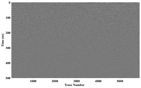 The surface acquisition system was configured in a common-offset geometry, comprising an array of 497 antennas (including both transmitters and receivers). For each transmitter, the emitted signal was recorded by three adjacent receivers. A Gaussian wavelet with a central frequency of 150 MHz was used as the input source, which was assumed to be known. The sampling interval was 0.5 ns. After converting the two-way travel time to one-way travel time, the original simulated GPR record (T = 300 ns) was truncated to 150 ns, as shown in Figure 5. This adjustment was necessary primarily because, in a common-offset system, the two-way travel time includes the round-trip path difference of EM waves. This effect introduces more significant curvature variations in the diffraction hyperbolas, which would otherwise complicate the identification of characteristic points and the application of the “parallelism check” scheme.
