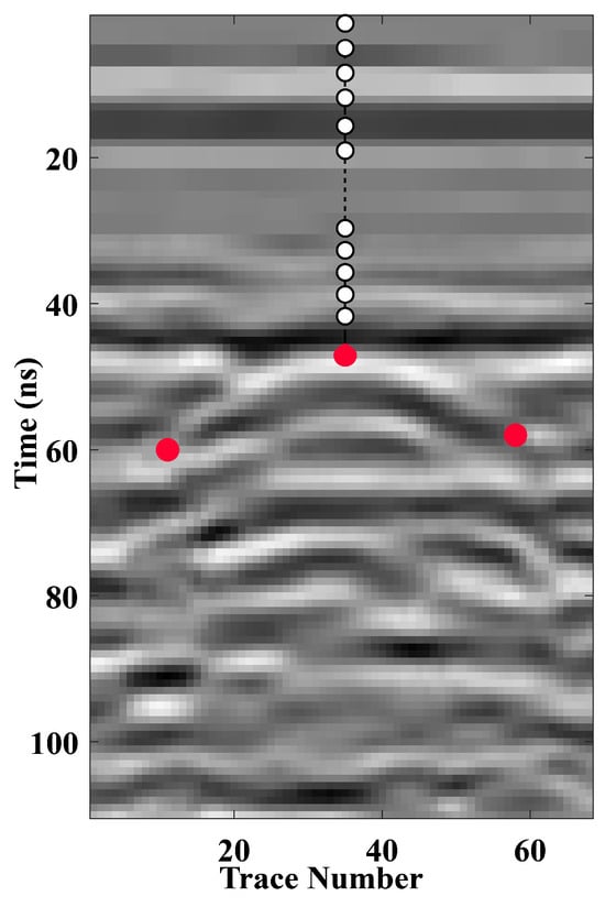 Since the randomly distributed scatterers in the layered model are slightly smaller than or comparable to the wavelength of the incident EM waves, the diffraction waves in the GPR profile exhibit high-curvature interfaces. The white hyperbolas in Figure 5 indicate the identifiable diffraction events, which correspond to the five embedded scatterers. These events were then sorted in ascending order of their apex arrival times and labeled sequentially as ①, ②, ③, ④, and ⑤. Three characteristic points were extracted from the record segment of each diffraction event.