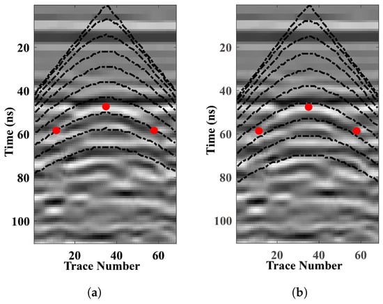 Next, we applied the “parallelism check” scheme described in Section 2 to evaluate the spatial relationship between the three characteristic points of the processed diffraction event ① and the surrounding simulated travel time curves. As illustrated in Figure 7a, when the assumed relative permittivity was set to , the three points intersected the adjacent simulated travel time curves, indicating a lack of parallelism. We therefore adjusted from 2 to 3 and recalculated the travel time curves for further comparison. Figure 7b shows that the three points became parallel to the adjacent simulated travel time curves after adjustment, confirming as the true relative permittivity of the current layer. Using this value, we re-conducted time-to-depth conversion on diffraction event ①, with the resulting depth defined as the bottom interface of the current layer (denoted as ). Theoretically, the number of identified layers should be consistent with the number of extracted diffraction events.