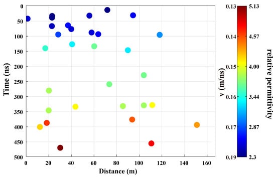Following the procedure outlined in Section 2, we first extracted the data segment of each diffraction event and then selected its three characteristic points. It should be noted that LPR field data often contain considerable clutter and noise around the hyperbolas, which may interfere with the extraction of characteristic points. Therefore, the following principles should be followed: (1) The true apex must lie on the symmetry axis of the hyperbola and generally corresponds to the strongest and most continuous signal peak. It is crucial to avoid mistaking high-amplitude noise artifacts for the apex; (2) The two flank reference points should preferably be selected from regions with continuous, amplitude-stable hyperbolic signals and must be symmetrically distributed relative to the apex. The three red spots in Figure 12 illustrate the characteristic points selected for diffraction hyperbola #1 according to these criteria.