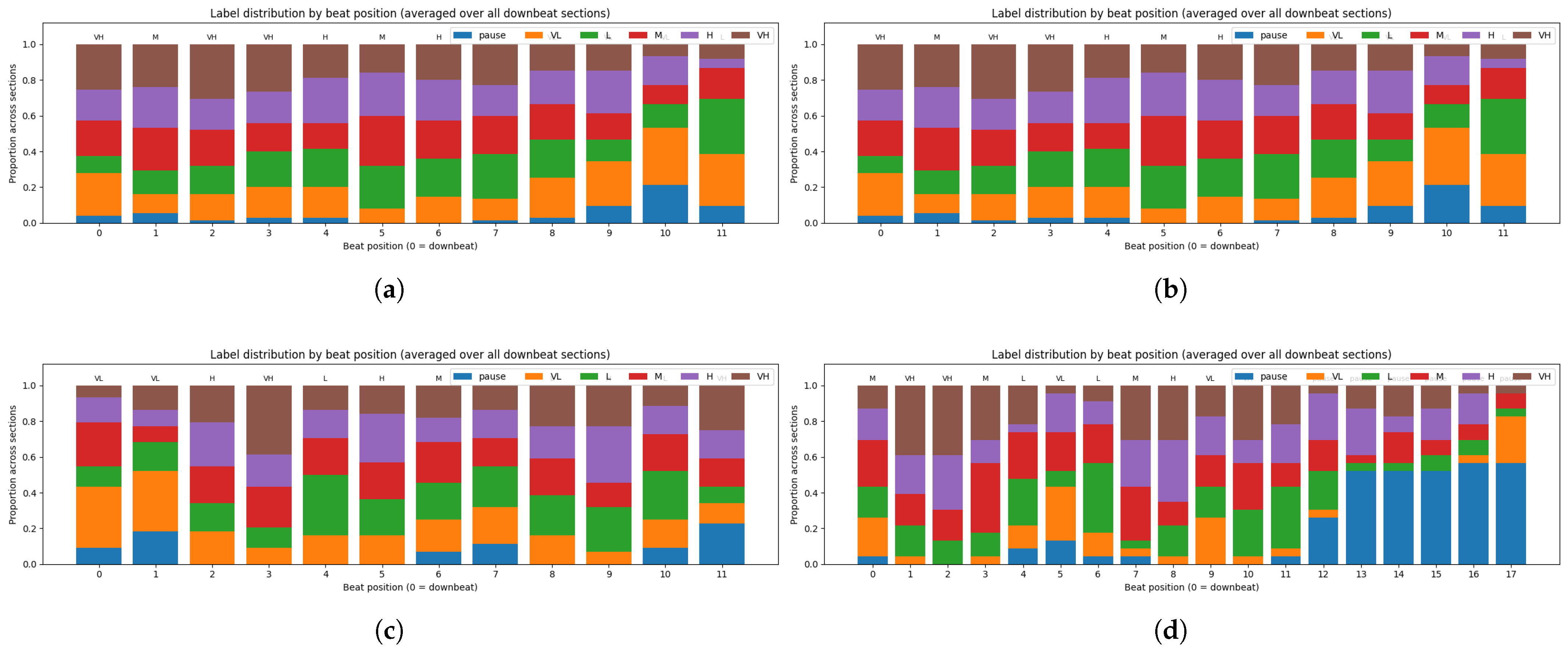 jangdan units. Each stacked bar represents the average proportion of pause, VL, L, M, H, and VH labels at each beat position, where position 0 corresponds to the downbeat, i.e., the