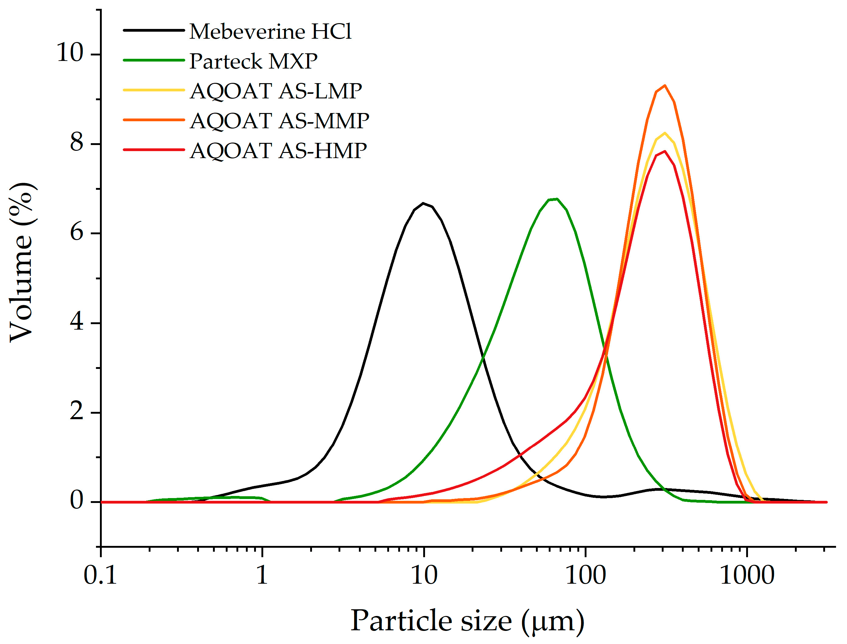 Figure 2). Median particle size (Dv50) of MebH was 10.8 ± 0.25 μm, while polymers were characterized by much bigger median particle size and were 57.3 ± 0.77 μm, 298 ± 8.44 μm, ±9.23 μm, and 259 ± 5.3 μm for PVA, AQOAT AS-LMP, AQOAT AS-MMP, and AQOAT AS-HMP, respectively. From a technological point of view, this difference may result in particle segregation and possible inhomogeneity in the polymer matrix. On the other hand, big AQOAT particles promote better flowability of the final blend and, thus, better filament diameter uniformity. The AQOAT particle size distributions revealed that AQOAT AS-HMP had the highest share of small particles, as the value of 10th percentile of particle size distribution (Dv10) was approximately 2-fold smaller than for the remaining two HPMC-AS grades. It is also clearly visible in