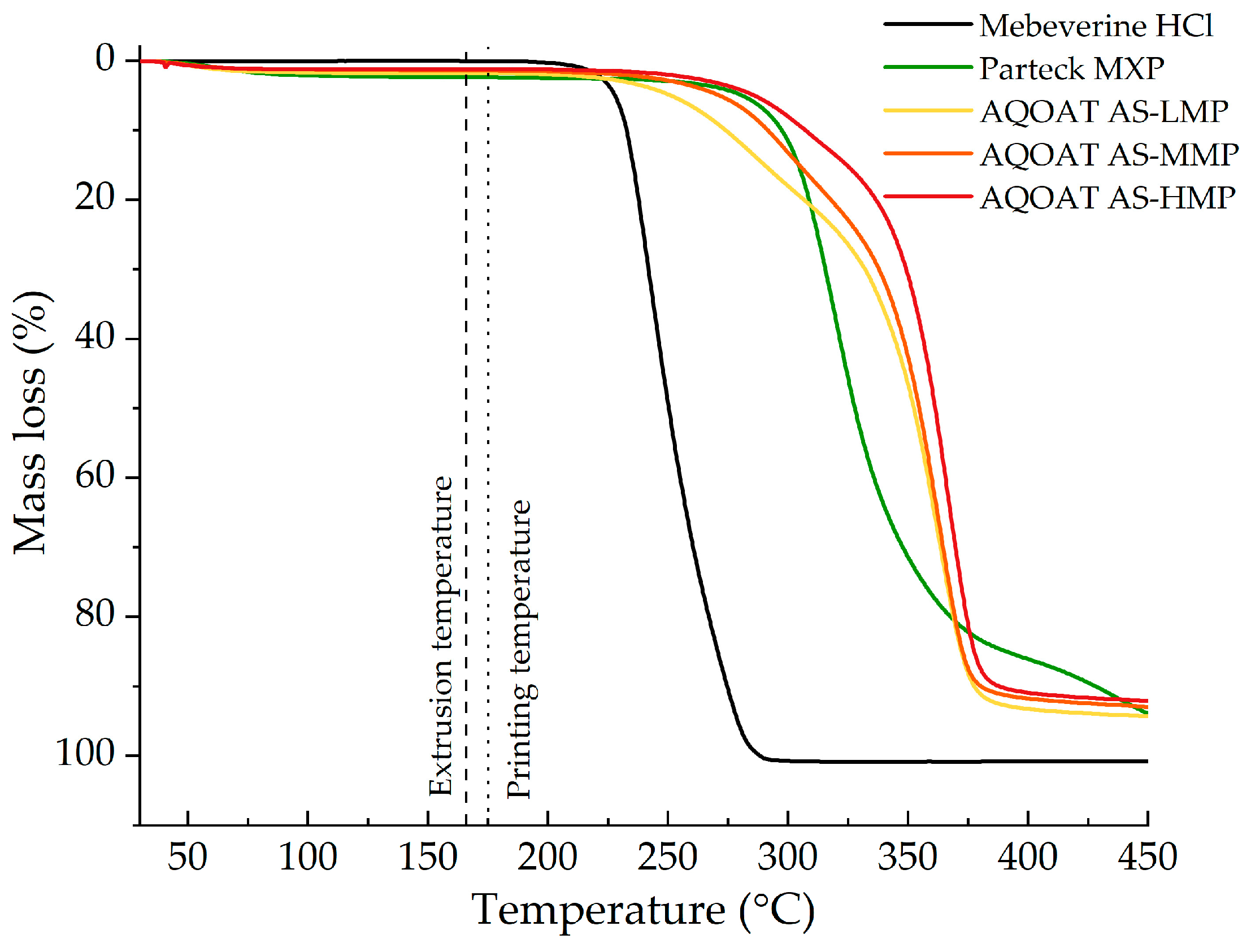 Figure 3 the TGA curves are presented, and the actual temperatures which were utilized during the filament extrusion and three-dimensional printing processes are marked with dashed and dotted lines, respectively. The TGA thermograms of the polymers displayed an initial mass loss of roughly 1.8–2.5% between 30 °C and 100 °C, attributed to the evaporation of adsorbed water and residual moisture from the sample surface. The variations in moisture content are directly correlated with the ratio of acetyl to succinyl groups in various grades of HPMC-AS. AQOAT AS-HMP is distinguished by the largest concentration of acetyl groups, which enhances hydrophobicity and, thus, leads to reduced moisture content. It is clearly visible that both processes were conducted in the “safe zone”. The 3D printing process required higher temperatures, as the molten material is pushed through the smaller nozzle and proper rheological properties of the material have to be assured.