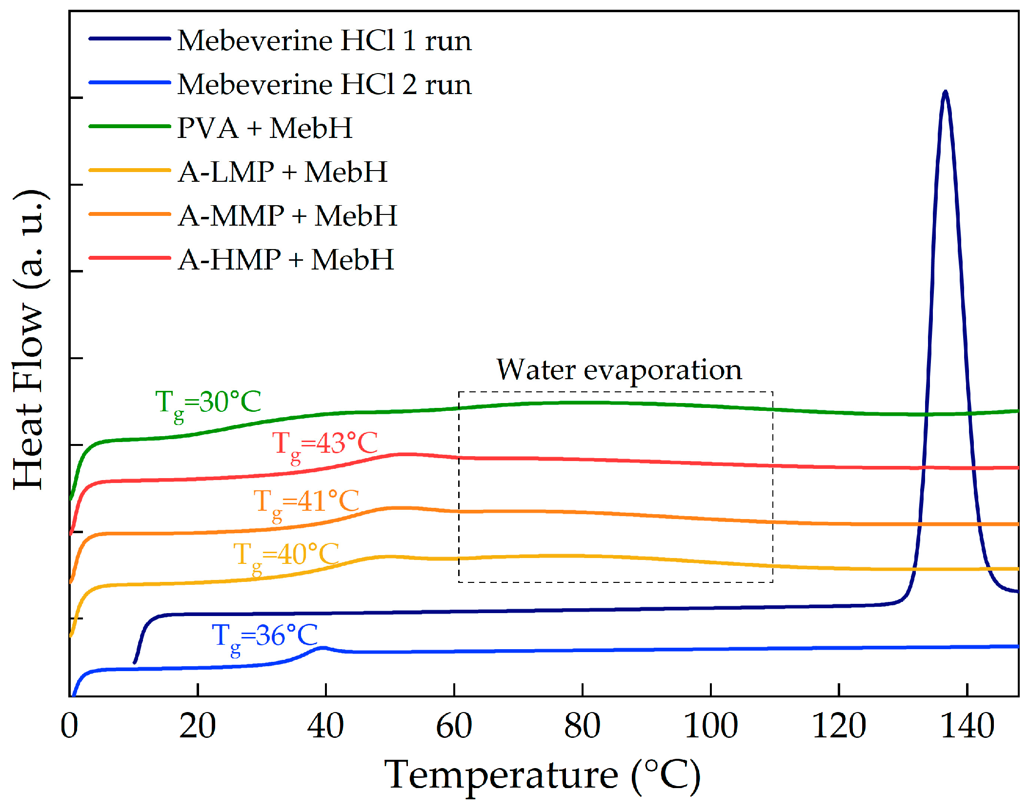 The thermal properties of mebeverine hydrochloride and all investigated MebH-based binary systems were measured using the Metler Tolledo STARe system (Columbus, OH, USA), equipped with an HSS8 ceramic sensor, 120 thermocouples, and the liquid nitrogen cooling accessory. The measuring device was calibrated for temperature and enthalpy using zinc and indium standards. The samples were placed in an aluminum crucible (40 μL). Both the initial, raw crystalline MebH and the pulverized 3D-printed tablets were heated up from 25 °C to 180 °C with a 10 °C/min rate under constant 50 mL/min nitrogen flow. The glass transition temperature was determined as the midpoint of the glass transition step, while the crystallization and melting temperatures were established at the onsets of the exothermic and endothermic peaks, respectively.