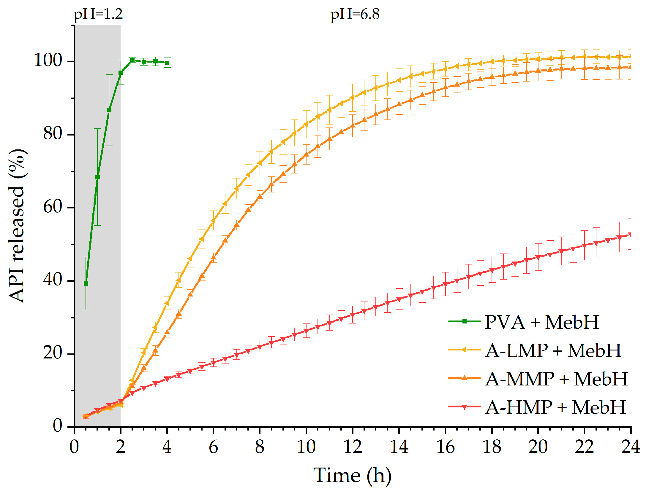 Table S1 in the Supplementary Materials. The gastric phase was conducted in the hydrochloride acid solution in pH = 1.2 for two hours and then pH was changed to 6.8; the dissolution test continued until a total run time of 24 h was reached. As the AQOATs are characterized by pH-dependent solubility only a small amount of the API was released in the acidic phase. Despite PVA having gelling properties in aqueous media and the PVA being the major component in the formulation of the filaments and, thus, tablets, the mebeverine hydrochloride was entirely released from this formulation within the first two hours; thus, the test was discontinued. The amount of API released from AQOAT in the acidic phase was independent from the AQOAT grade and was ca. 7%. After transition to the pH = 6.8, sustained release of the API was observed. The drug release from AQOAT AS-LMP and AS-MMP-based tablets have similar courses; over 90% of mebeverine hydrochloride was released after 12 or 15 h, respectively. However, the dissolution from the AQOAT AS-HMP-based formulation is substantially different and it is characterized by markedly extended release; after 24 h, only 52.8 ± 4.2% of the drug was released. It is caused by the pH-dependent solubility of the polymer. The dissolution of AQOAT AS-HMP occurs at pH levels exceeding 6.5. Given that the dissolution medium has a marginally elevated pH, the pH microenvironment at the polymer-solution interface may significantly impede the dissolution of mebeverine hydrochloride [