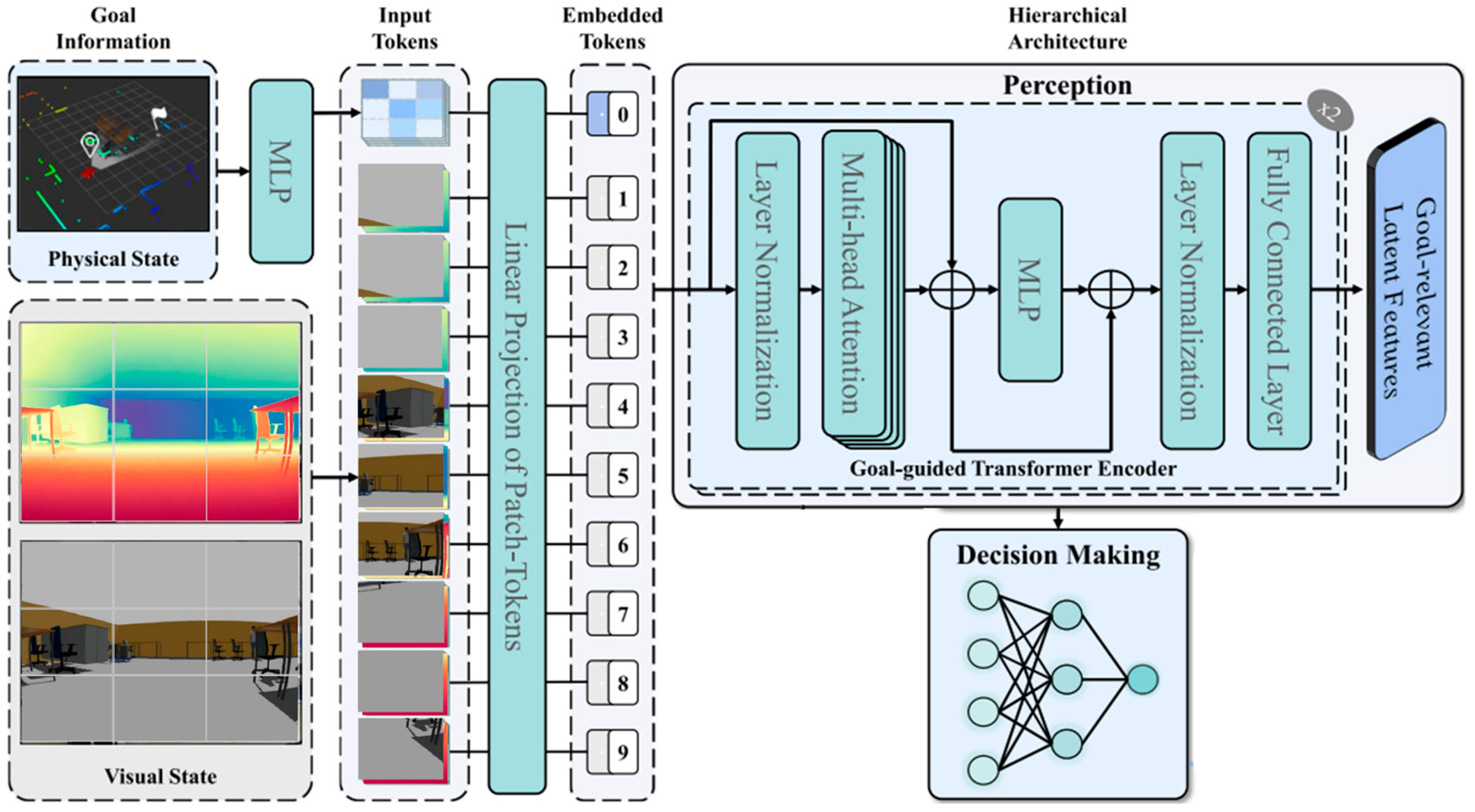 Table 4, further clarified the role of the appearance, geometry, and temporal redundancy. The ablation experiments confirmed that appearance and geometry are complementary and essential. Geometry alone, as tested in the gray-and-depth (G-D) variant, proved insufficient. By removing color semantics such as wall–floor contrast and object boundaries, the policy struggled to navigate robustly, achieving only 14.0% success and an average reward of −1.25 with unstable convergence. We then investigated if temporal redundancy could compensate. Stacking four G-D frames (4G-D) did improve stability, increasing the success rate to 26.0% and the reward to +25.4. This confirms that motion cues from temporal stacking provide useful, stabilizing information. However, even with this improvement, 4G-D failed to approach the performance of the color-enabled variants, demonstrating that temporal cues cannot substitute for the rich semantic information provided by color. Finally, we investigated whether adding temporal data to our best modality would yield further gains. While the four-stacked RGB-D (4RGB-D) variant combines appearance, geometry, and temporal cues, the resulting 16-channel input created a dimensional explosion. The patch embeddings grew to a size of 5120, which destabilized the training process. Beyond this dimensional challenge, other factors likely contributed to this collapse. Our lightweight Transformer (2 blocks, 4 heads) was held constant across all experiments for a fair comparison, and it likely lacked the parameter capacity to effectively process such a high-dimensional input vector. Furthermore, this large input made the optimization problem significantly harder. The fixed SAC hyperparameters (such as the learning rate) used across all experiments were likely ill-suited for this more complex task, leading to the observed training instability. Consequently, the performance degraded markedly to just 16.0% success and a −6.7 reward. This outcome demonstrates that brute-force temporal stacking is computationally inefficient and ultimately less effective than a principled, single-frame fusion of complementary modalities.