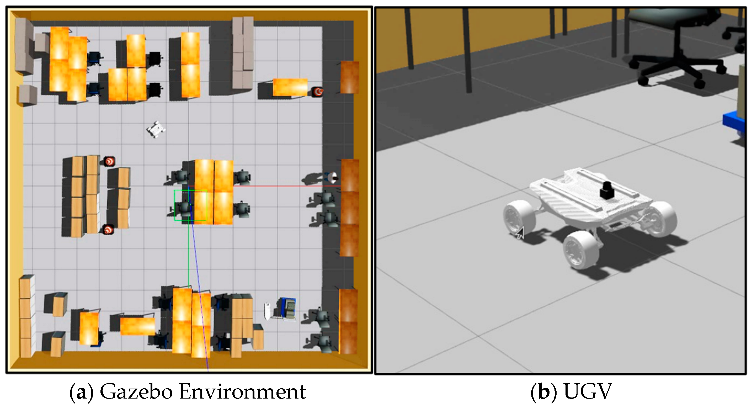 . These observations were designed to directly mirror real-world sensor setups, ensuring that the simulation findings remain transferable in principle. Our simulation environment and the unmanned ground vehicle (UGV) model are depicted in