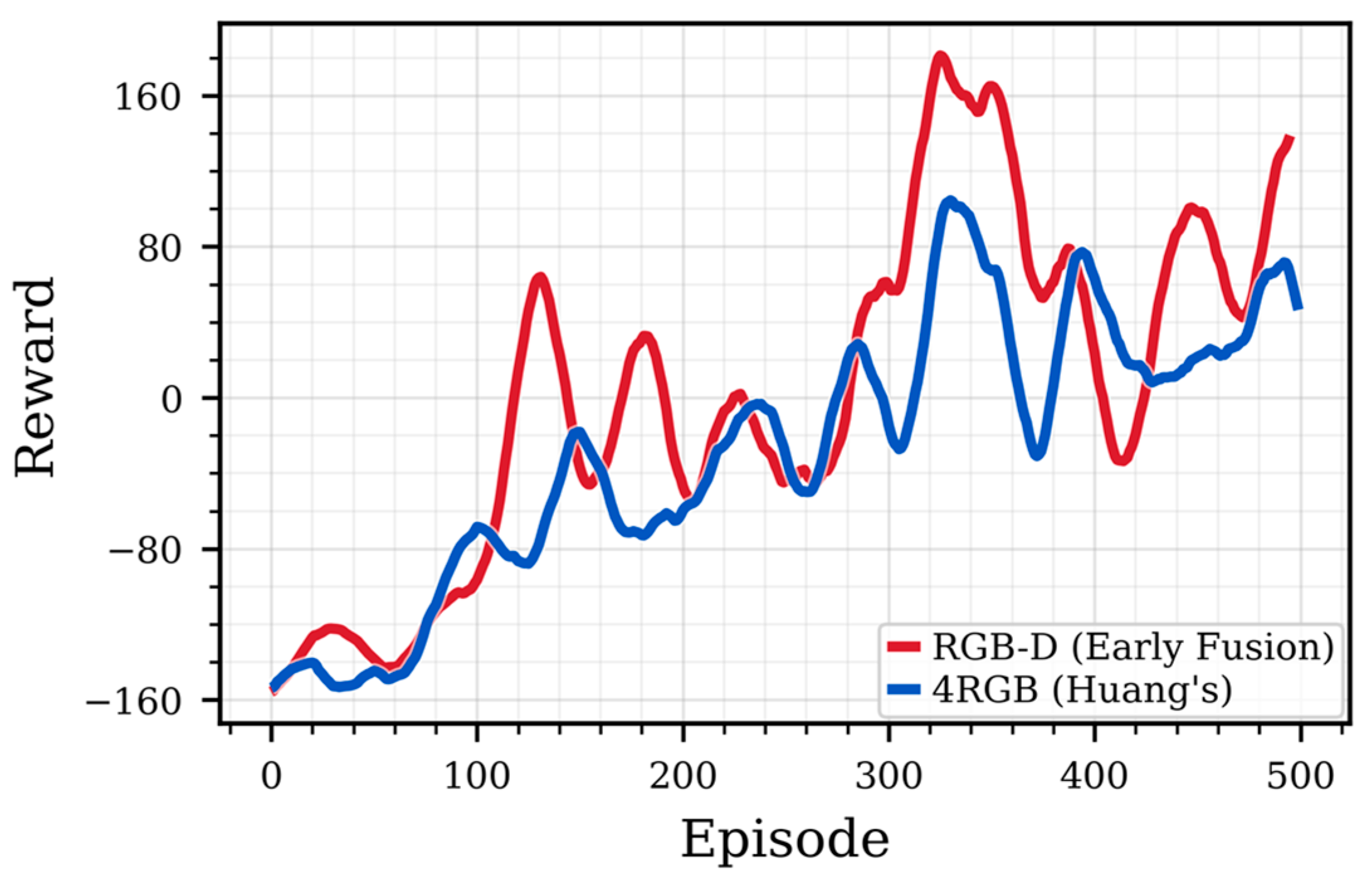 ) of episodic rewards over 500 training episodes for both the 4RGB baseline and the proposed RGB-D (Early Fusion) method. The RGB-D agent not only converges faster but also achieves higher final performance and exhibits lower variance across three independent runs. A direct comparison between Huang’s 4RGB baseline and our proposed RGB-D formulation demonstrates the clear benefit of incorporating explicit geometry. Evaluated using the key metrics of success rate and average reward, the RGB-D modality reaches 40.0% ± 4.2% success and a +94.1 ± 15.8 reward. This significantly surpasses the 4RGB baseline, which achieved 28.0% ± 3.5% success and a +35.2 ± 10.1 reward. This corresponds to a 12% increase in the success rate and nearly a threefold improvement in the reward. The learning curves, presented in