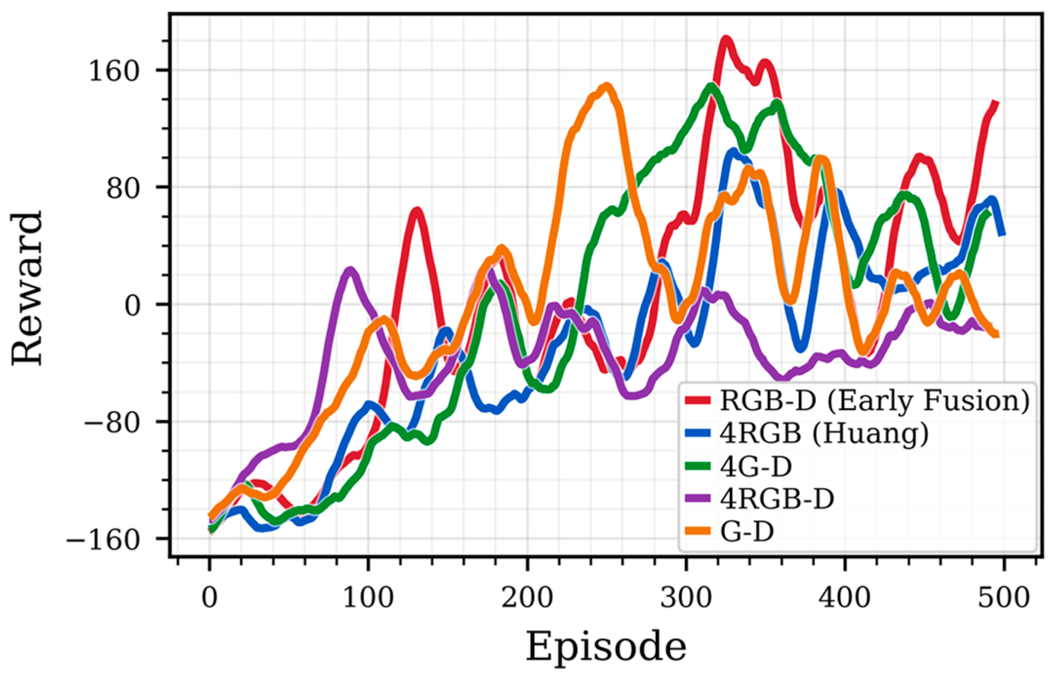 ) to visualize learning stability and convergence over 500 episodes. The plot provides clear visual evidence of the RGB-D agent’s robust learning trajectory, which consistently achieves the highest rewards. In stark contrast, the erratic and low-reward curves of the G-D and 4RGB-D variants illustrate the instability caused by insufficient semantic cues and excessive input dimensionality, respectively. Even with the addition of temporal cues, the 4G-D variant fails to match the performance of color-enabled modalities, highlighting that motion information cannot fully substitute for rich appearance features.