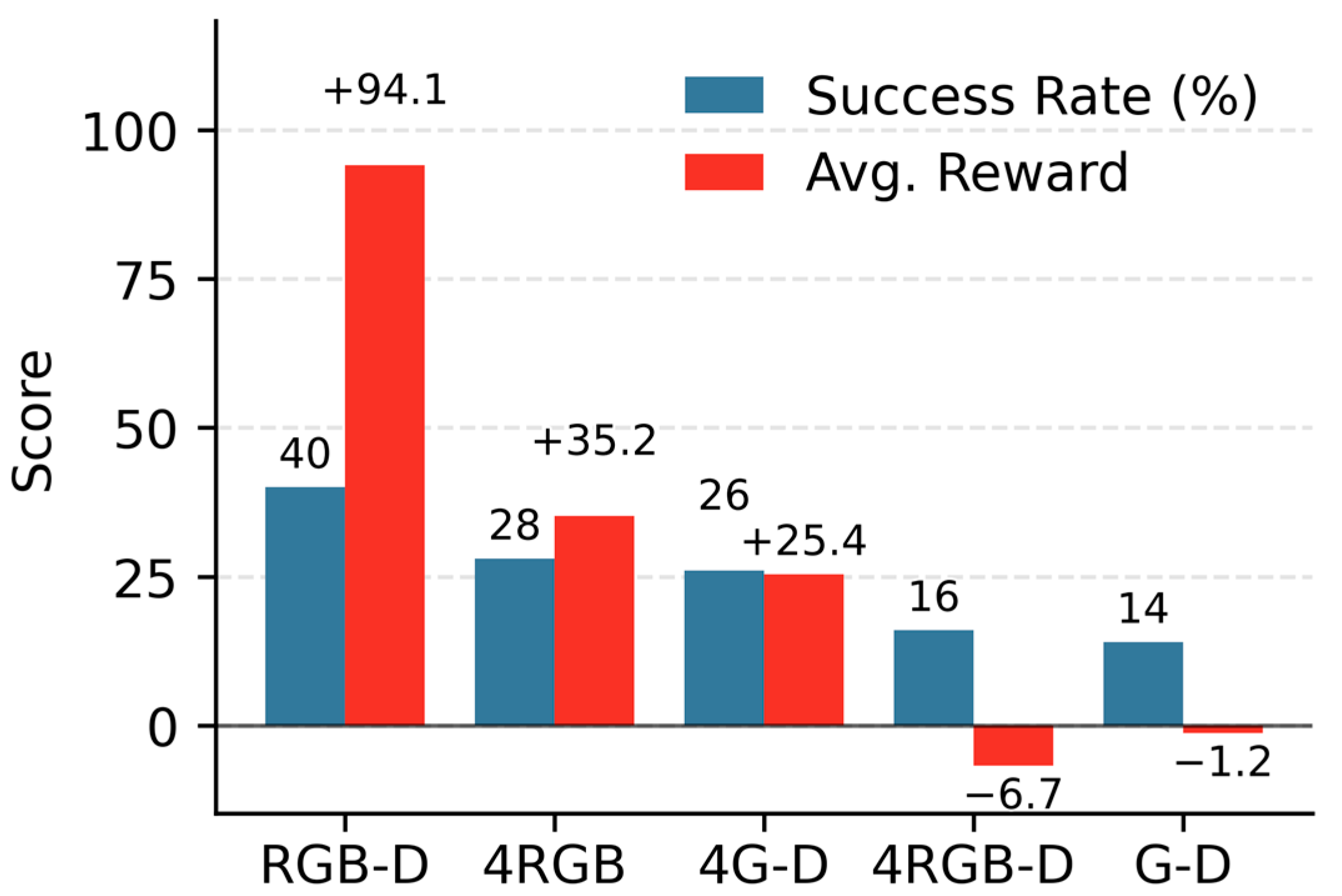 Figure 5 provides a visual summary of the final navigation performance by comparing the success rate (bars) and the average reward (line) across the five tested modality variants: RGB-D, 4RGB, Gray and Depth (G-D), Four Stacked Gray and Depth (4G-D), and Four Stacked RGB and Depth (4RGB-D). The figure confirms that RGB-D achieved the highest performance, clearly surpassing the 4RGB baseline. Geometry-only inputs (G-D) and stacked temporal inputs (4G-D and 4RGB-D) are shown to underperform, establishing evidence that appearance and geometry are complementary and that temporal stacking alone is inadequate.