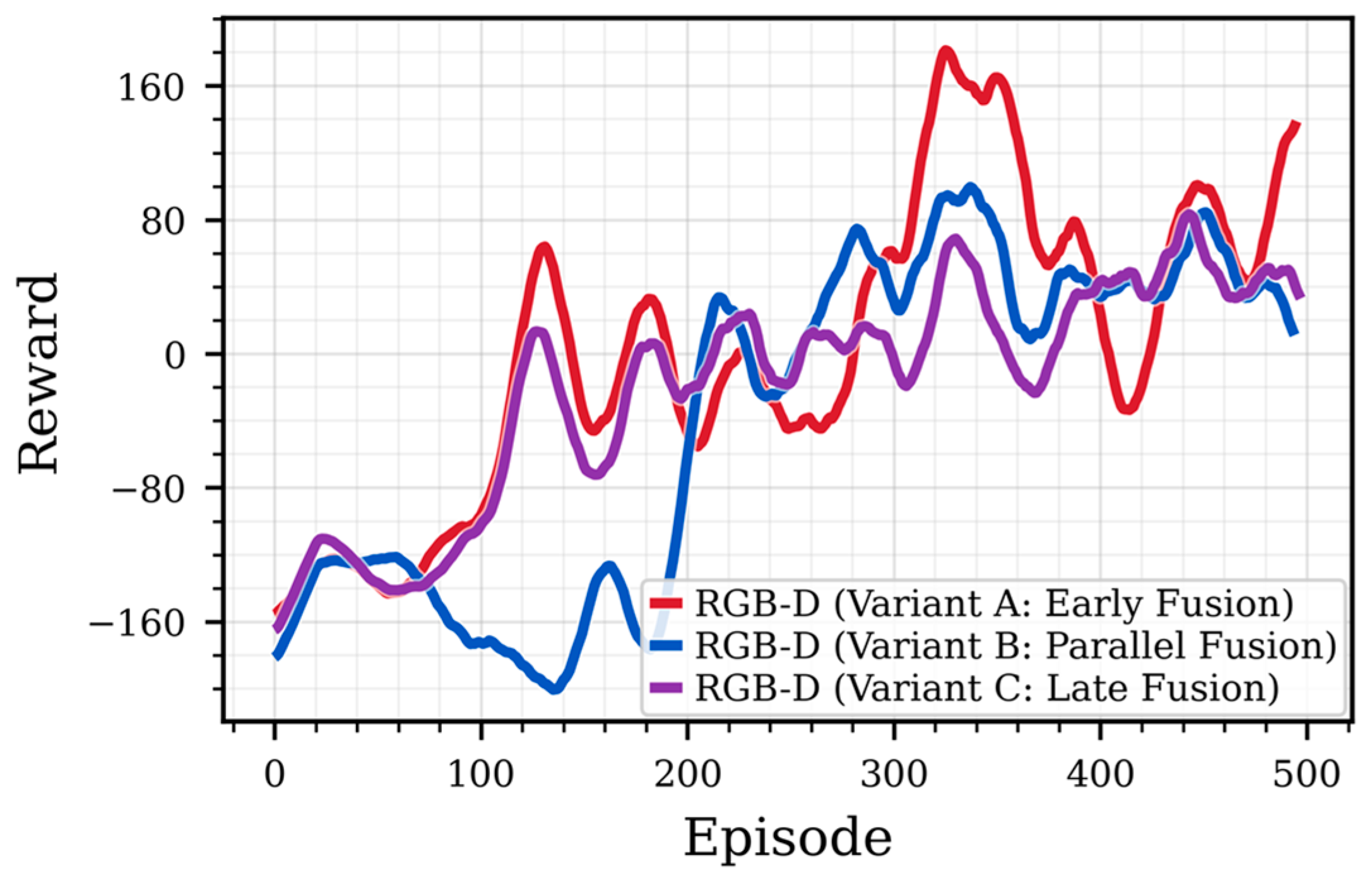 Figure 6 displays the training reward curves, calculated using a moving average (k = 20), for the three investigated fusion strategies: Early Fusion (Variant A), Parallel Encoding (Variant B), and Late Fusion (Variant C). The visualization highlights the critical role of fusion stage design, demonstrating that Early Fusion (Variant A) consistently yields the highest and most stable rewards throughout the 500 training episodes. In sharp contrast, Parallel Encoding (Variant B) exhibits an early and catastrophic performance collapse. The Late Fusion (Variant C) strategy shows a smoother but significantly weaker trajectory, converging below both Variant A and the Parallel Encoding collapse point.