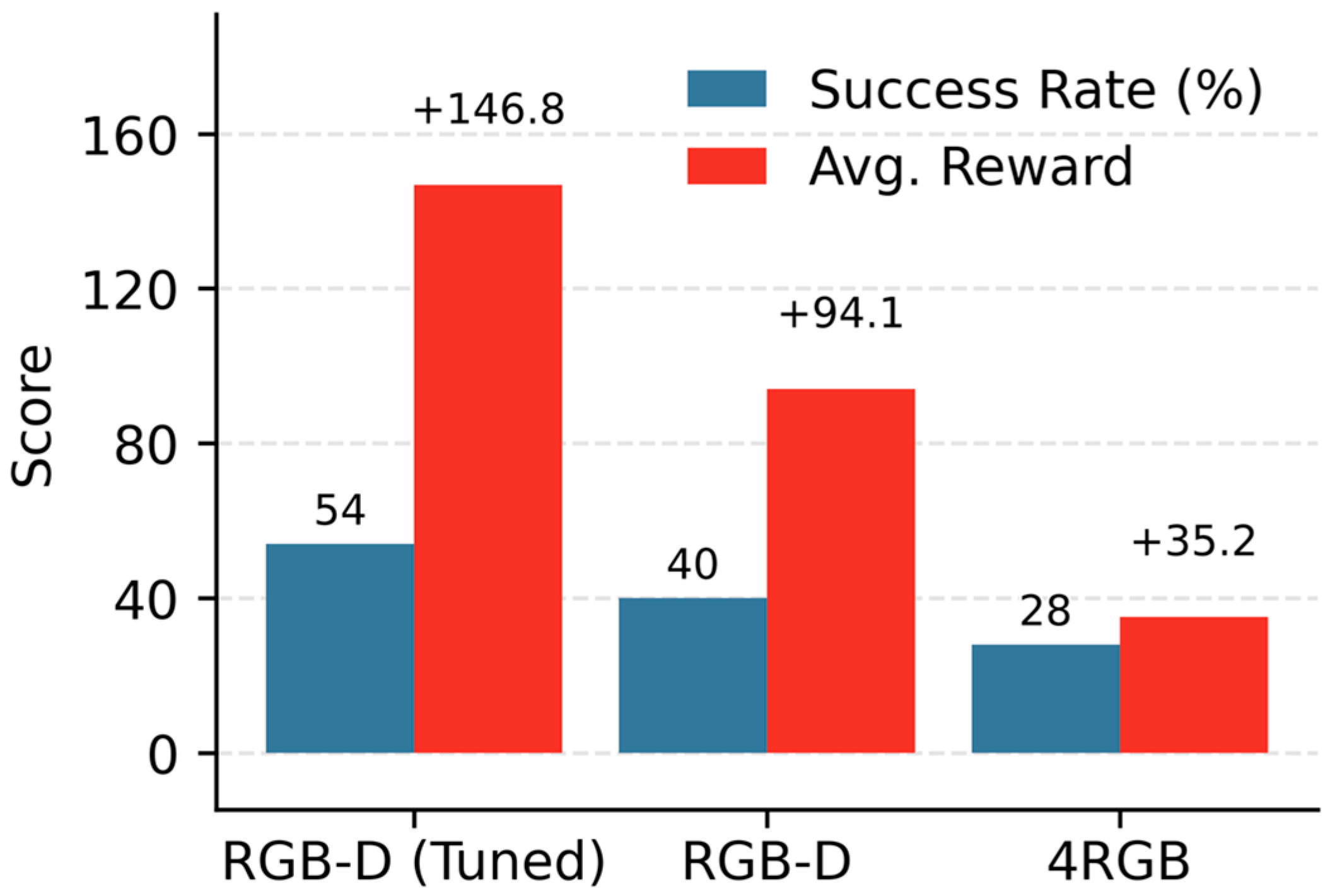 Figure 9 provides a final performance comparison across Huang’s 4RGB baseline, the original RGB-D policy, and the tuned RGB-D configuration. The figure distinctly shows that the tuned configuration achieves the highest success rate and average reward. This result underscores the inherent superiority of the RGB-D modality over 4RGB and highlights the potential for achieving substantial further gains through modest hyperparameter tuning.