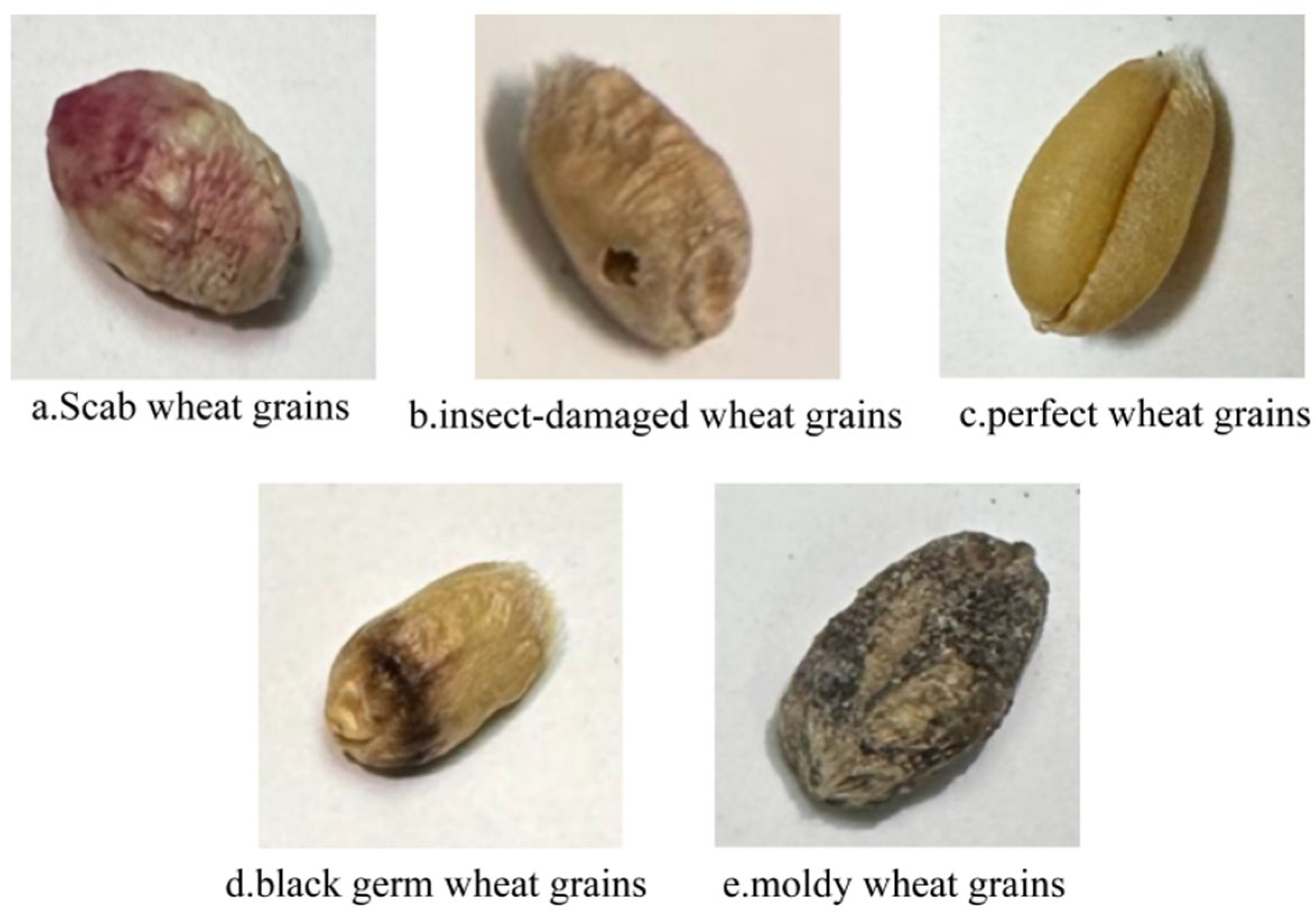 The defective wheat kernel dataset used in this study was collected from local farmers’ households (Heze, China). Since wheat from different cultivars is commonly stored together after harvesting, the dataset comprises kernels from multiple varieties. Nevertheless, the defective kernels exhibit consistent visual characteristics across varieties, enabling unified analysis and classification. The dataset includes five categories of wheat kernels: sound kernels, insect-damaged kernels, Fusarium-damaged kernels, moldy kernels, and kernels with black embryos. Representative examples of each category are shown in