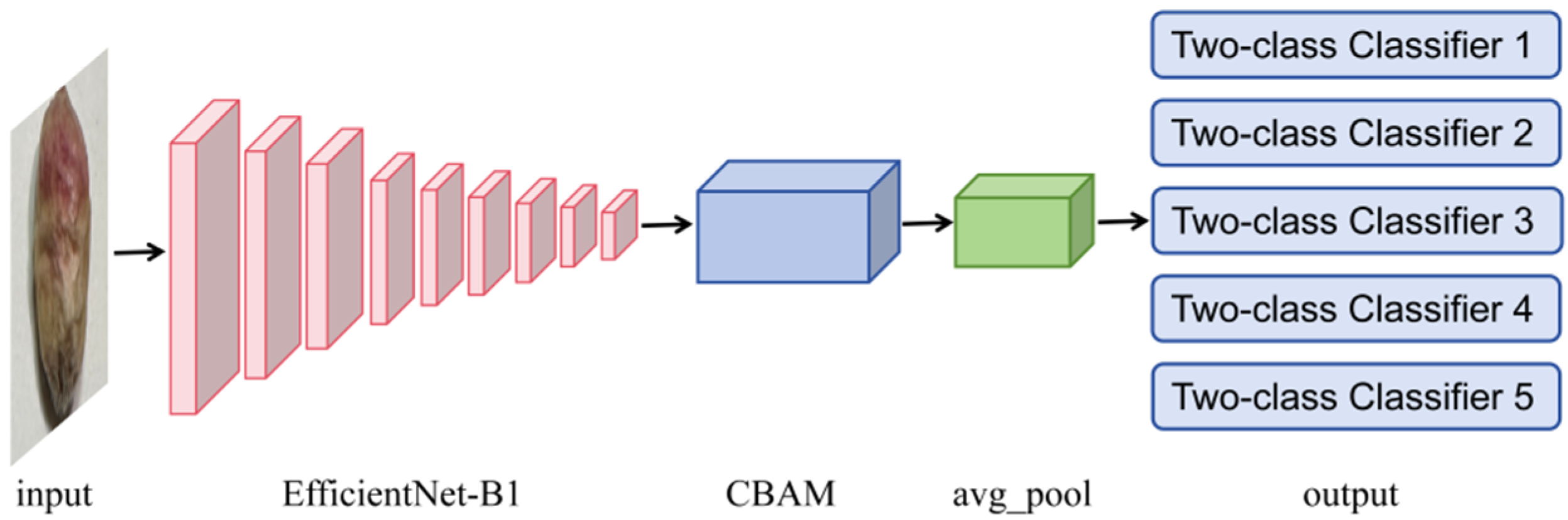 First, the input images are fed into the EfficientNet-B1 backbone for feature extraction. This network employs a compound scaling strategy to jointly balance depth, width, and resolution, and utilizes lightweight MBConv blocks to achieve efficient feature extraction and information compression. Subsequently, the Convolutional Block Attention Module (CBAM), which consists of channel attention and spatial attention submodules, is integrated to enhance feature representation. The channel attention mechanism highlights informative feature channels through adaptive weighting, while the spatial attention mechanism emphasizes salient regions via spatial attention maps. Together, these mechanisms enable the model to focus more effectively on subtle surface variations and pathological characteristics of wheat kernels. After global average pooling, the extracted global features are fed into five independent binary classifiers in a one-vs.-rest manner, corresponding to Fusarium-damaged, insect-damaged, sound, black-embryo, and moldy wheat kernels, respectively. This multi-binary classification design allows each category to learn class-specific decision boundaries independently, thereby reducing feature interference among visually similar classes and improving overall recognition performance.