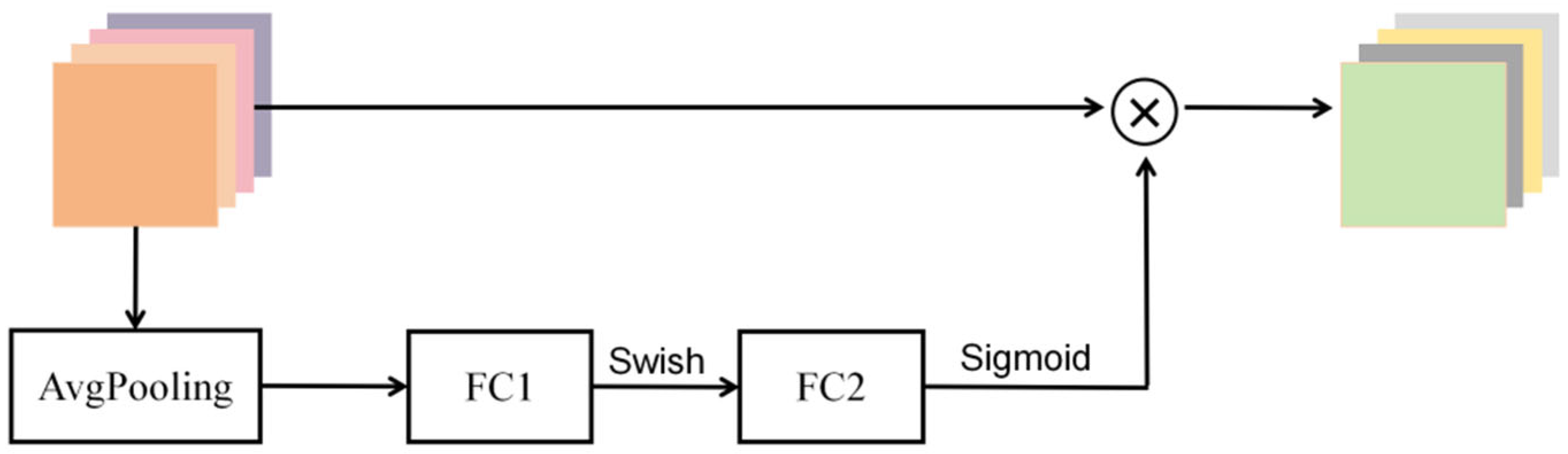 Figure 4. In conventional convolutional neural networks, each channel is typically assigned equal importance during feature extraction, neglecting differences in the representational capacity of individual channels. The SE module explicitly models inter-channel dependencies and adaptively assigns weights to each channel, thereby achieving dynamic feature recalibration and effectively strengthening the network’s feature representation capability. The SE module consists of two main stages: Squeeze and Excitation. In the Squeeze stage, the input feature map is first compressed into a single global descriptor for each channel via global average pooling (GAP), capturing channel-level holistic information. In the Excitation stage, a bottleneck structure composed of two fully connected layers (FC1 and FC2) performs non-linear feature modeling. The first fully connected layer reduces the number of channels by a ratio r (the channel reduction ratio) to lower computational cost while capturing compact inter-channel dependencies. The second fully connected layer restores the channel dimension to its original size, and a Sigmoid function generates weight coefficients in the range [0, 1], reflecting the relative importance of each channel. Finally, these weights are multiplied with the original feature map channel-wise, enhancing salient features and suppressing redundant information, thereby improving the network’s capacity for effective feature representation and discrimination. The computational process of the SE module can be expressed as: