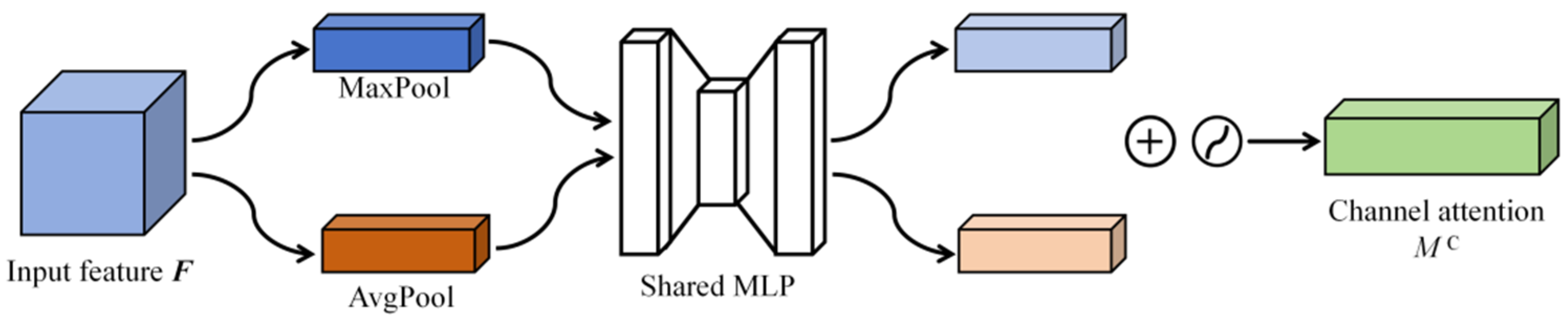Here, denotes the global average pooling operation, represents the ReLU activation function, is the Sigmoid function, and indicates the channel-wise weighting operation. In the absence of the attention module, the feature map is represented as .