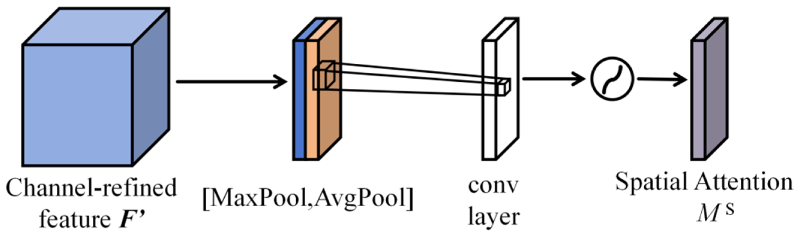 These two feature maps represent the average and maximum responses across all channels at each spatial location, jointly reflecting the importance of target regions. The two maps are then concatenated along the channel dimension and passed through a 7 × 7 convolution layer to aggregate spatial context information, thereby generating the spatial attention map:
