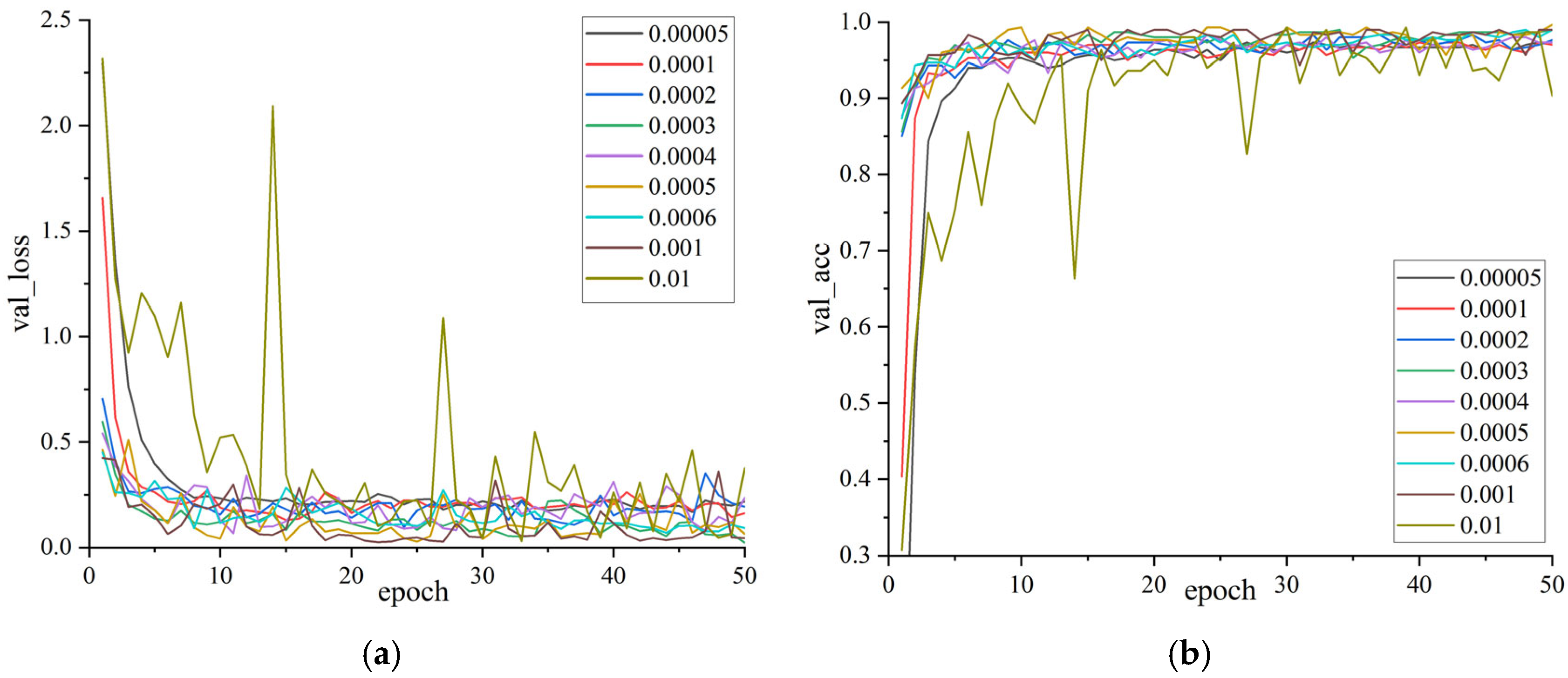 As all images were captured under identical acquisition conditions, two data augmentation techniques—Gaussian blurring and Poisson noise injection—were applied to enhance data diversity and improve model generalization. Through this augmentation process, the number of images for each wheat kernel category was expanded from the original 200 images to 600 images, resulting in a total augmented dataset of 3000 images. For each wheat kernel category, the augmented dataset was further divided into training and validation sets at a ratio of 9:1. Specifically, 540 images per category were used for network training, while the remaining 60 images constituted the validation set. The training set was employed for model learning, whereas the validation set was used for hyperparameter tuning and optimal model selection. The independent test set was retained for the final performance evaluation of the proposed model.