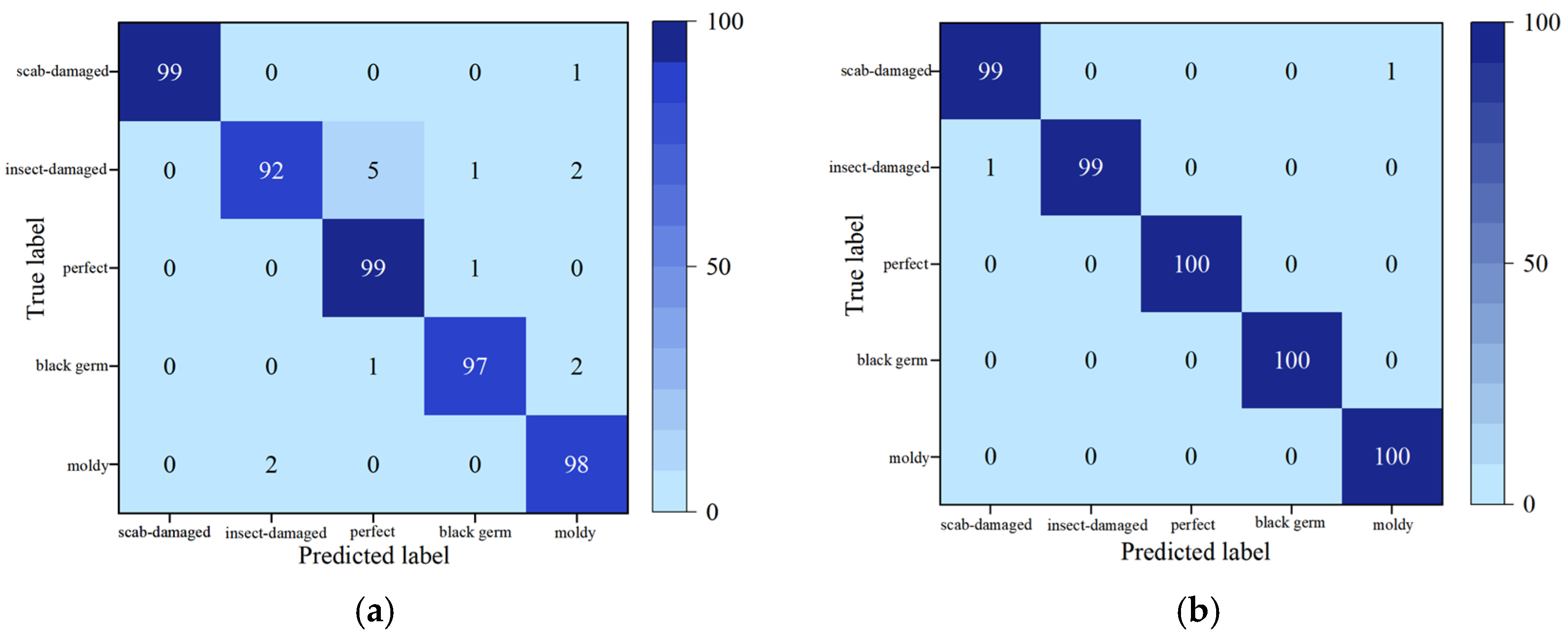 Despite the promising results, several limitations remain. All experiments were conducted on single-kernel images captured under controlled conditions. The model has not yet been evaluated on bulk-grain scenarios, overlapping kernels, or images acquired from conveyor belts, which are common in industrial environments. As a result, the practical applicability of the proposed method in real-world production lines is still unclear. Future work will focus on extending the dataset to include multi-kernel, overlapping, and conveyor belt imagery to better simulate industrial conditions. Additionally, exploring model adaptation techniques, such as domain adaptation or lightweight deployment on edge devices, will be pursued to enhance the method’s robustness and scalability in practical wheat processing systems.