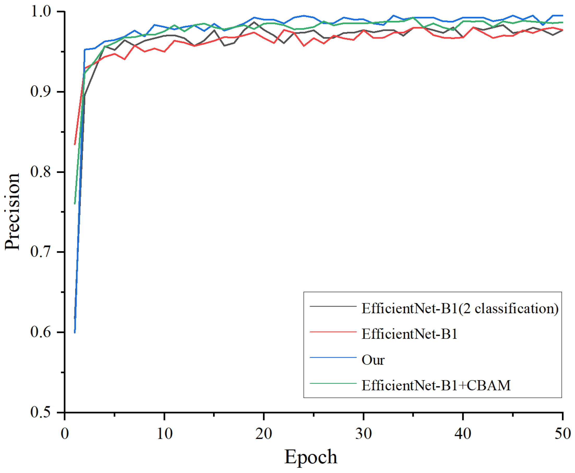 The entire network is composed of a series of stacked MBConv blocks, with MBConv modules at different stages varying in terms of channel width, kernel size, and stride. This design enables a progressive feature extraction process that transitions from shallow to deep representations and from low-dimensional to high-dimensional features. The network begins with a standard convolutional layer responsible for extracting low-level features from the input images. The intermediate stages consist of multiple groups of MBConv blocks, where each group reduces the spatial resolution to varying degrees while gradually increasing the number of channels to enhance feature representation capability. Finally, global average pooling followed by a fully connected classification head is employed to generate the final predictions. Compared with traditional convolutional neural networks, EfficientNet-B1 offers a notable advantage in achieving high accuracy while maintaining relatively low computational complexity. On large-scale datasets such as ImageNet, EfficientNet-B1 has been shown to achieve accuracy comparable to, or even exceeding, that of larger models such as ResNet and Inception. Owing to these characteristics, EfficientNet-B1 is particularly well suited for agricultural applications involving limited data and computational resources, such as wheat kernel classification and inspection tasks, where both accuracy and efficiency are critical.