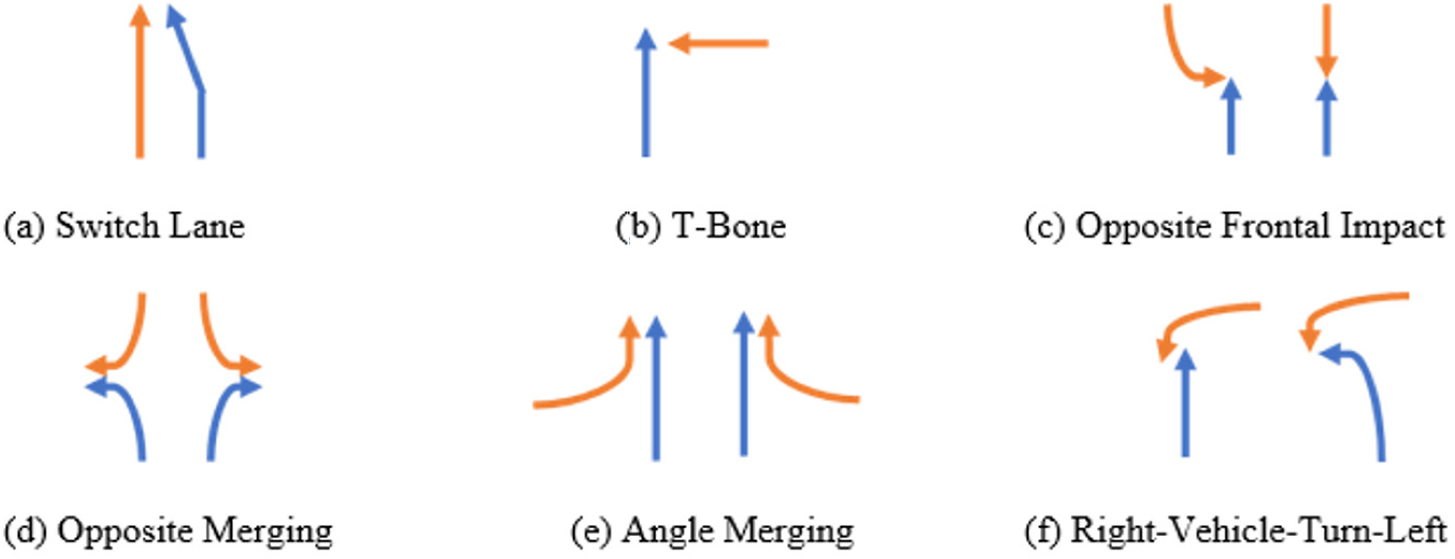 Figure 2 illustrates the representative trajectories of colliding vehicles for all collision types except Vehicle–Pedestrian Collision and Rear End. Each pair of blue and orange arrows represents a collision scenario between two vehicles.