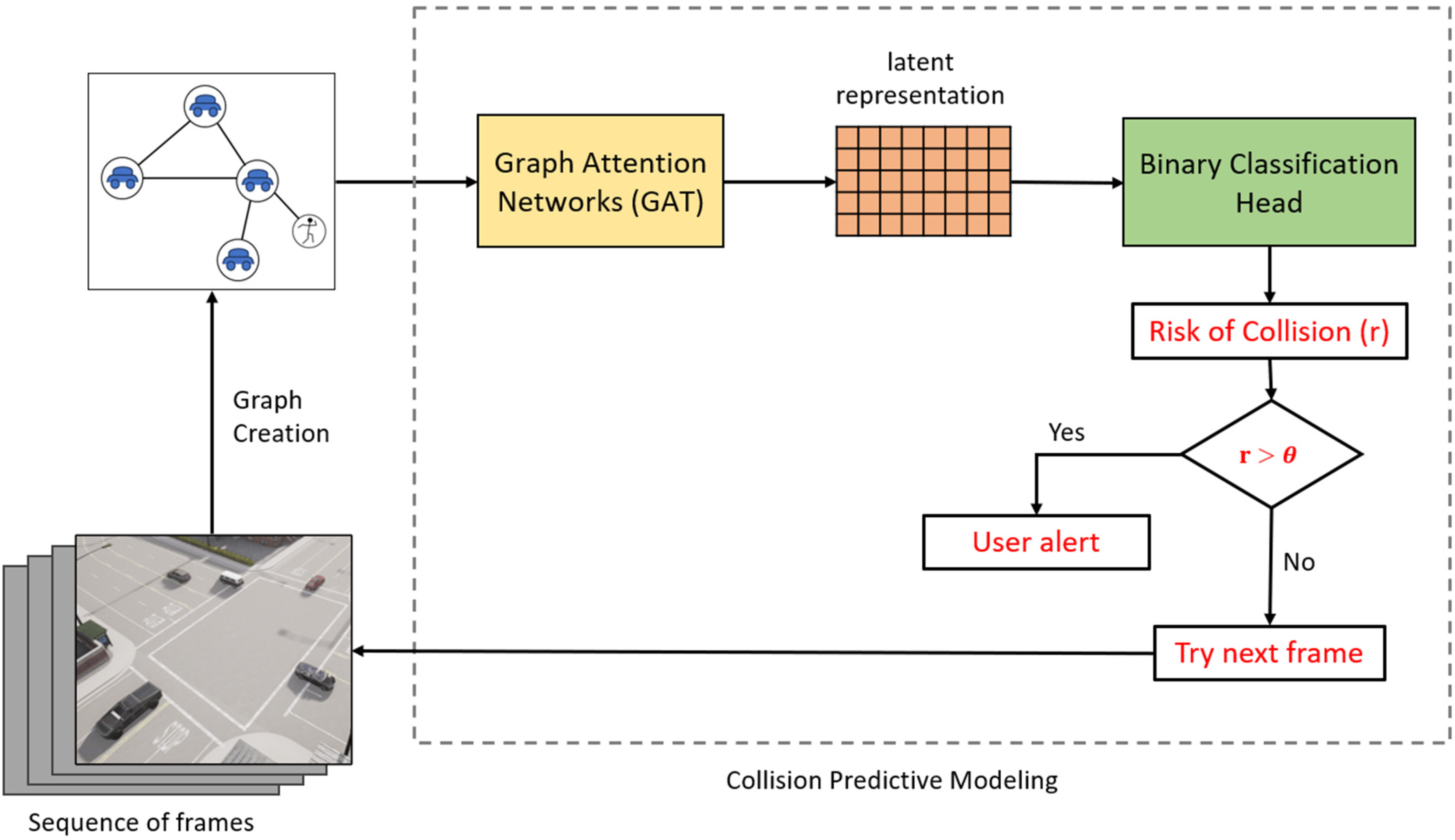T, we consider a sequence of preceding frames within a defined temporal window to model the evolving scene context. Within this window, a dynamic graph is constructed where nodes represent individual road users and edges encode their spatiotemporal relationships. This graph is processed by a GAT, which learns informative embeddings for each node by attending to relevant neighboring nodes and capturing their dynamics. The learned embeddings encode both motion patterns and inter-user interactions that could signal potential collision risk. Finally, the embeddings are passed to a binary classifier to predict the likelihood of a collision. The overall process is illustrated in