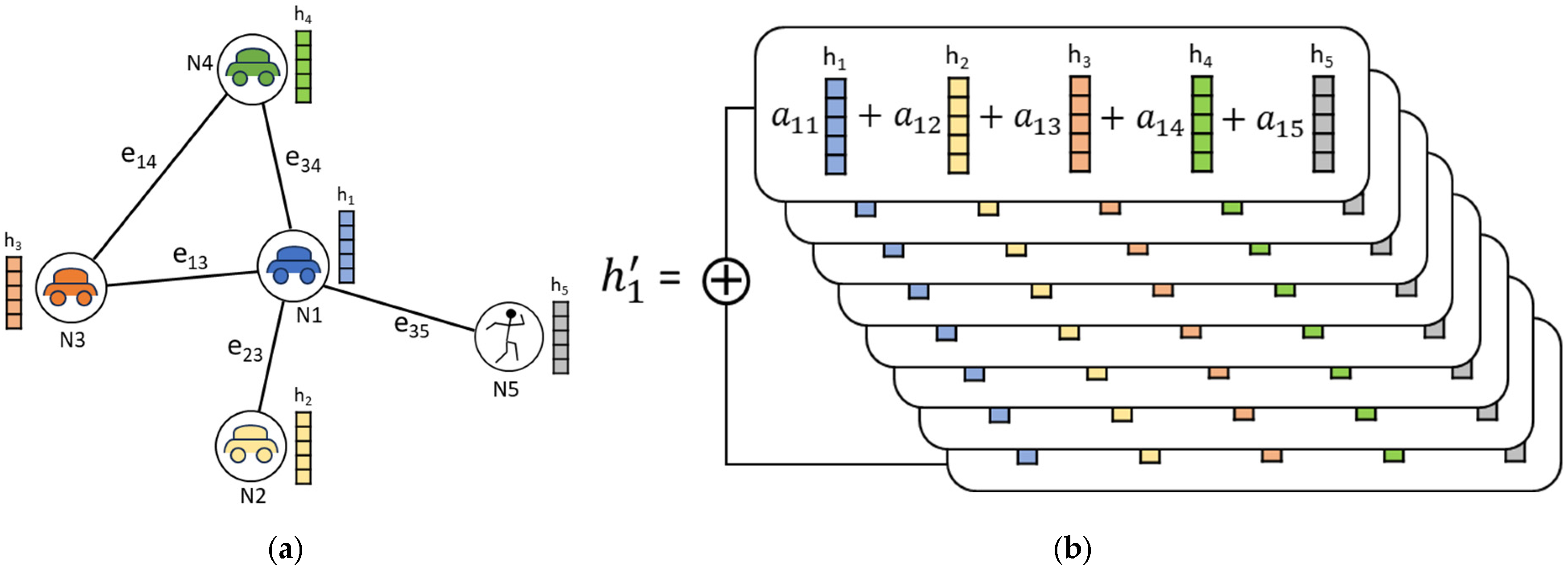 Computing the embeddings for Node 1 with the multi-head self-attention mechanism. (a) Road user graph representation; (b) Concatenating multi-head self-attentions.