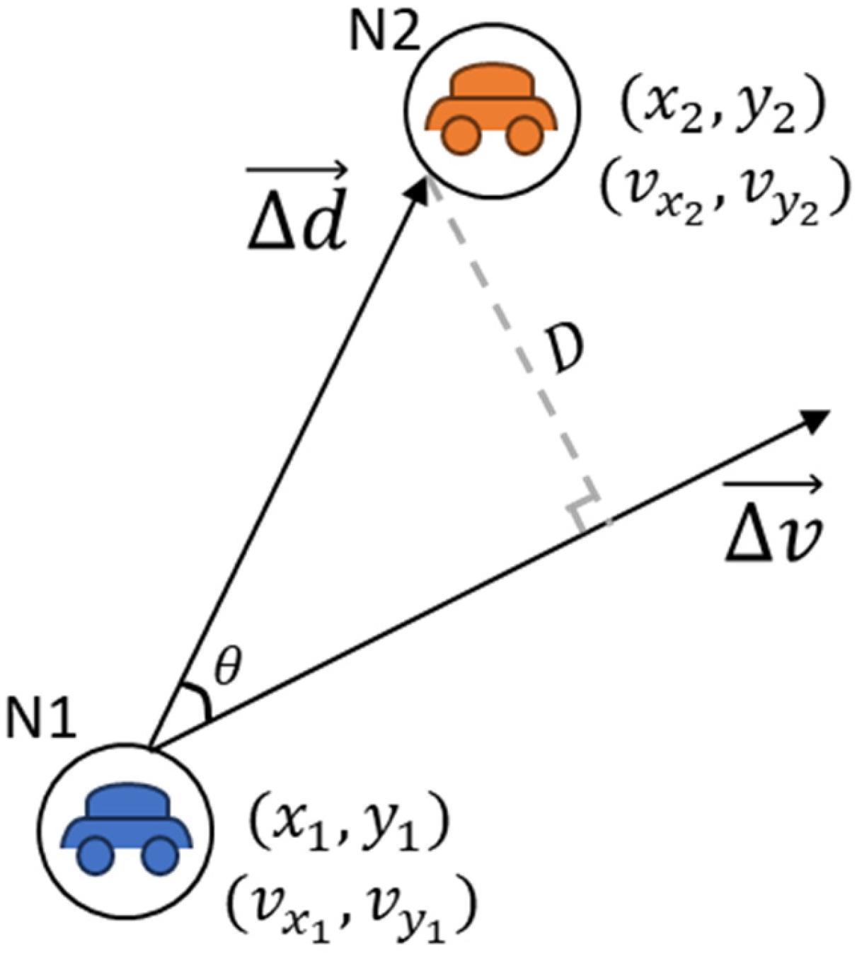 Specifically, when θ is acute, the projection of the relative velocity onto the relative position vector is negative, implying that the two road users are moving closer to each other and will reach their minimum separation at a future time. In contrast, when θ is a right angle or obtuse, the projection is non-negative, indicating that the minimum distance has already been reached and the road users are moving apart.