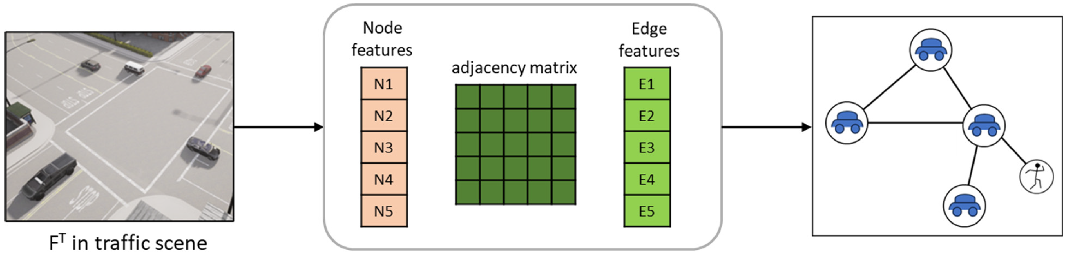 Figure 7, node features, the adjacency matrix, and edge features are all derived from this single frame, resulting in a purely spatial interaction graph at time