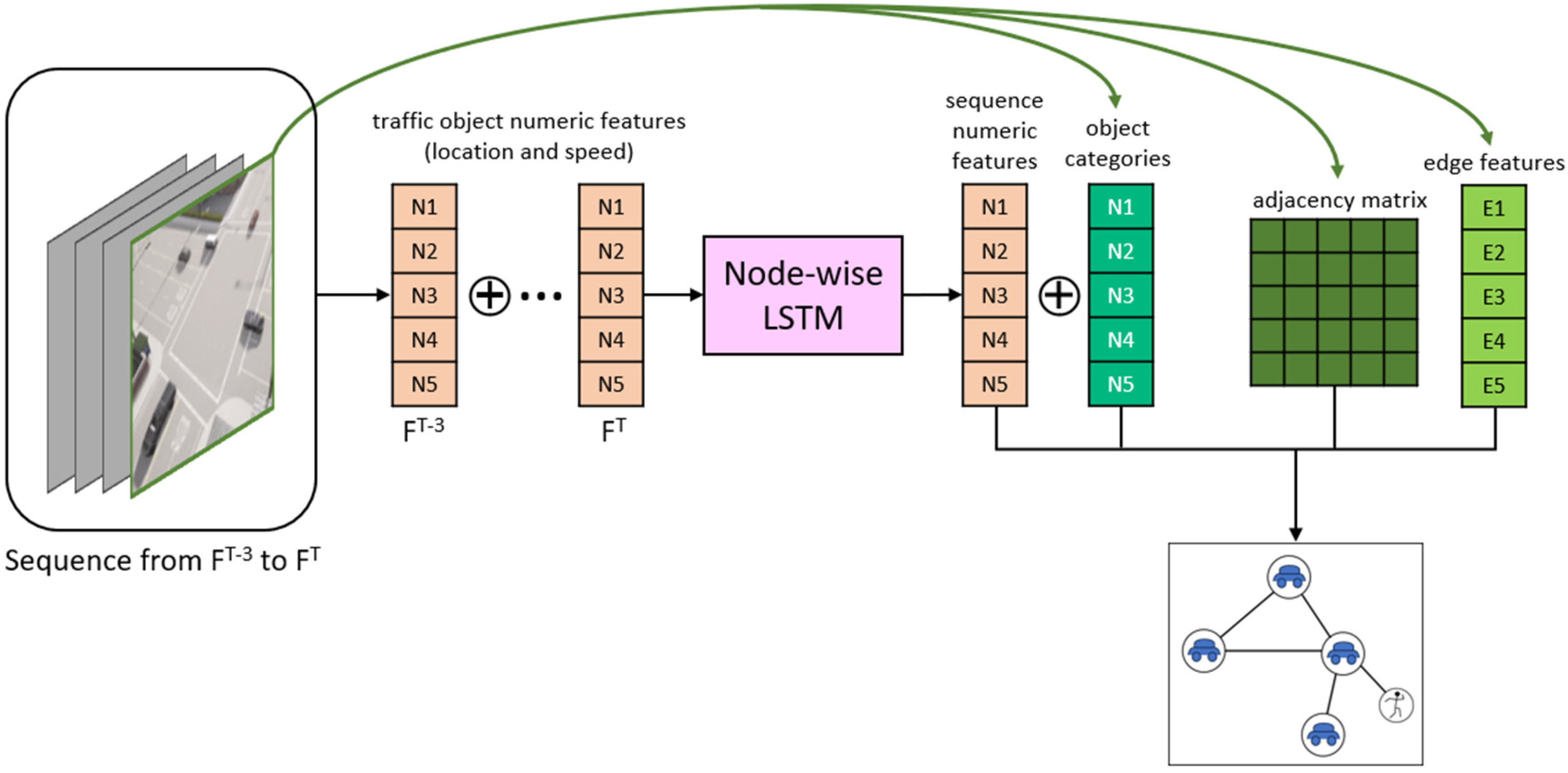 The second strategy explicitly incorporates temporal dynamics by leveraging a short sequence of four consecutive frames, including the previous three frames FT-3, FT-2, FT-1, and the current frame FT. Graph nodes are defined based on the road users detected in the current frame, ensuring a consistent node set for prediction at timestamp T. For each node, the corresponding locations and velocities at timestamps T-3, T-2, T-1, and T are concatenated to form an input sequence to a node-wise Long Short-Term Memory (LSTM) network, which applied to each node separately. Each time step in the sequence represents the road user’s state at a specific timestamp and includes location and velocity as features.