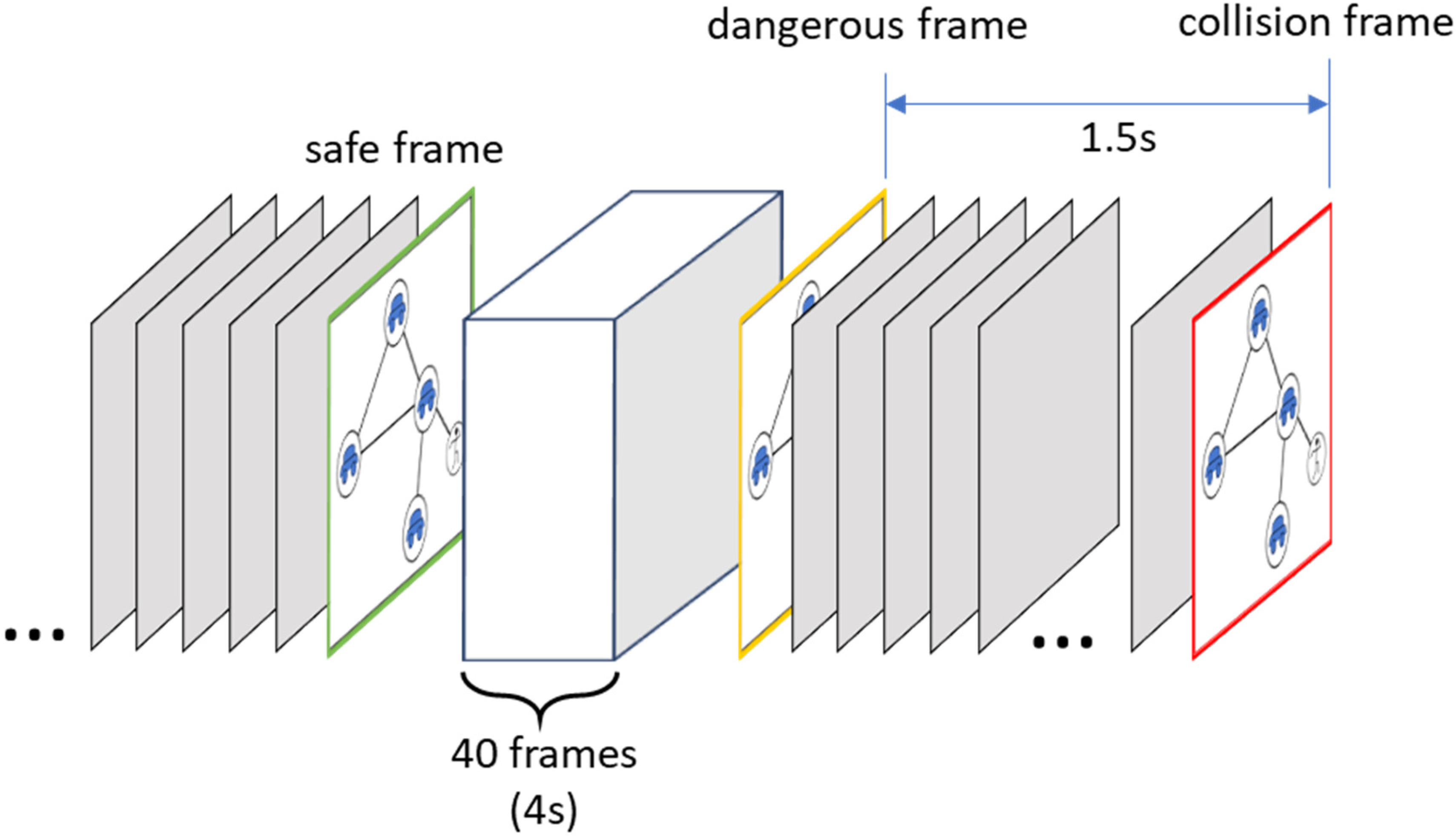48], a lead time of 1.5 s is adopted in this study. Accordingly, during model training, a video frame occurring 1.5 s prior to the collision, and its corresponding interaction graph, is labeled as dangerous. A temporally earlier frame, captured 4 s before the dangerous frame, is labeled as safe. While shorter lead times typically yield higher classification accuracy due to the increased availability of collision-relevant features, they offer limited practical value for early warning. The adopted lead time therefore reflects a principled trade-off between predictive performance and operational relevance.