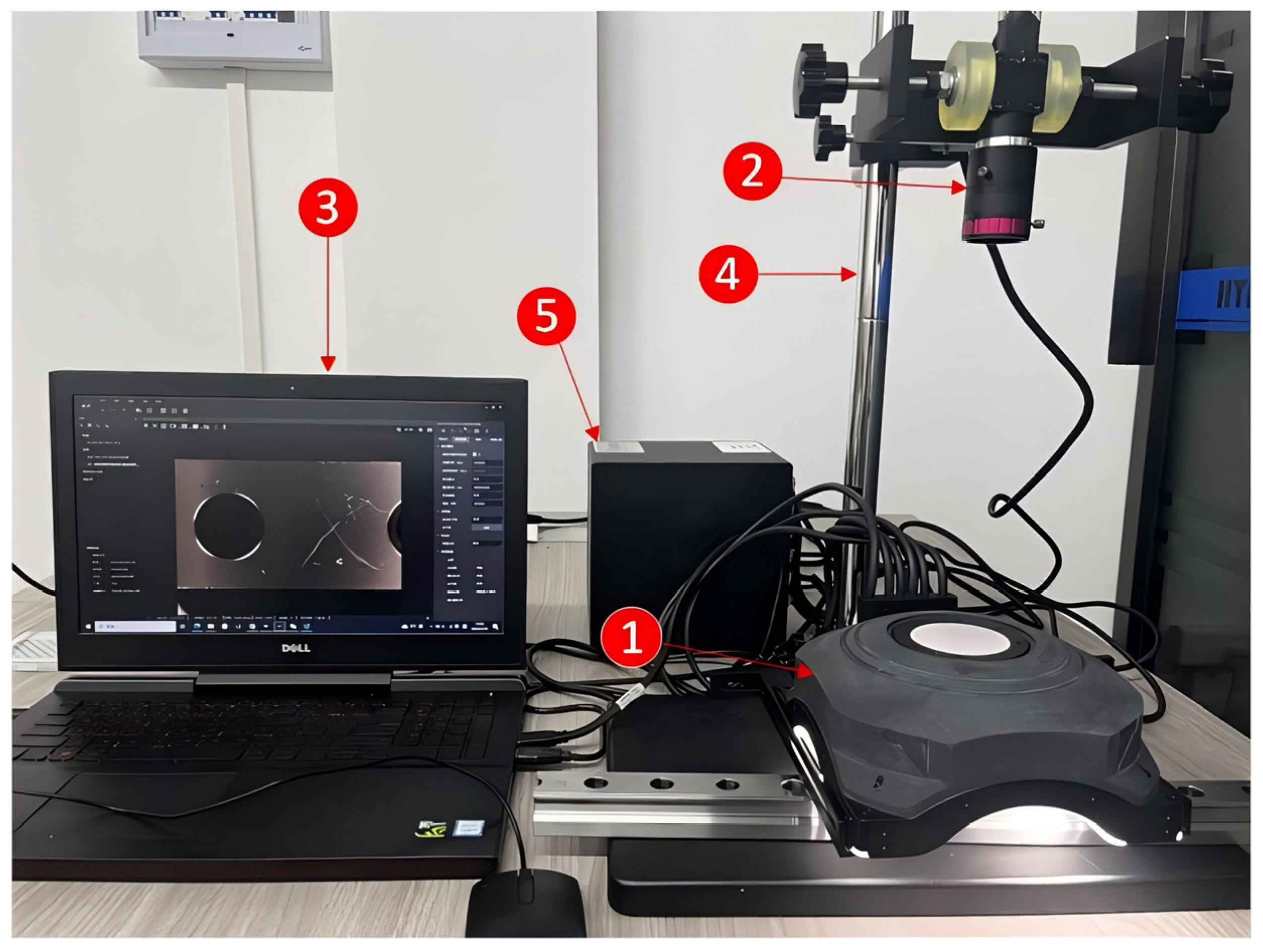 Figure 2, an adjustable dome light source is employed in this study to construct an image acquisition system for guide rail surface defect inspection. As illustrated in