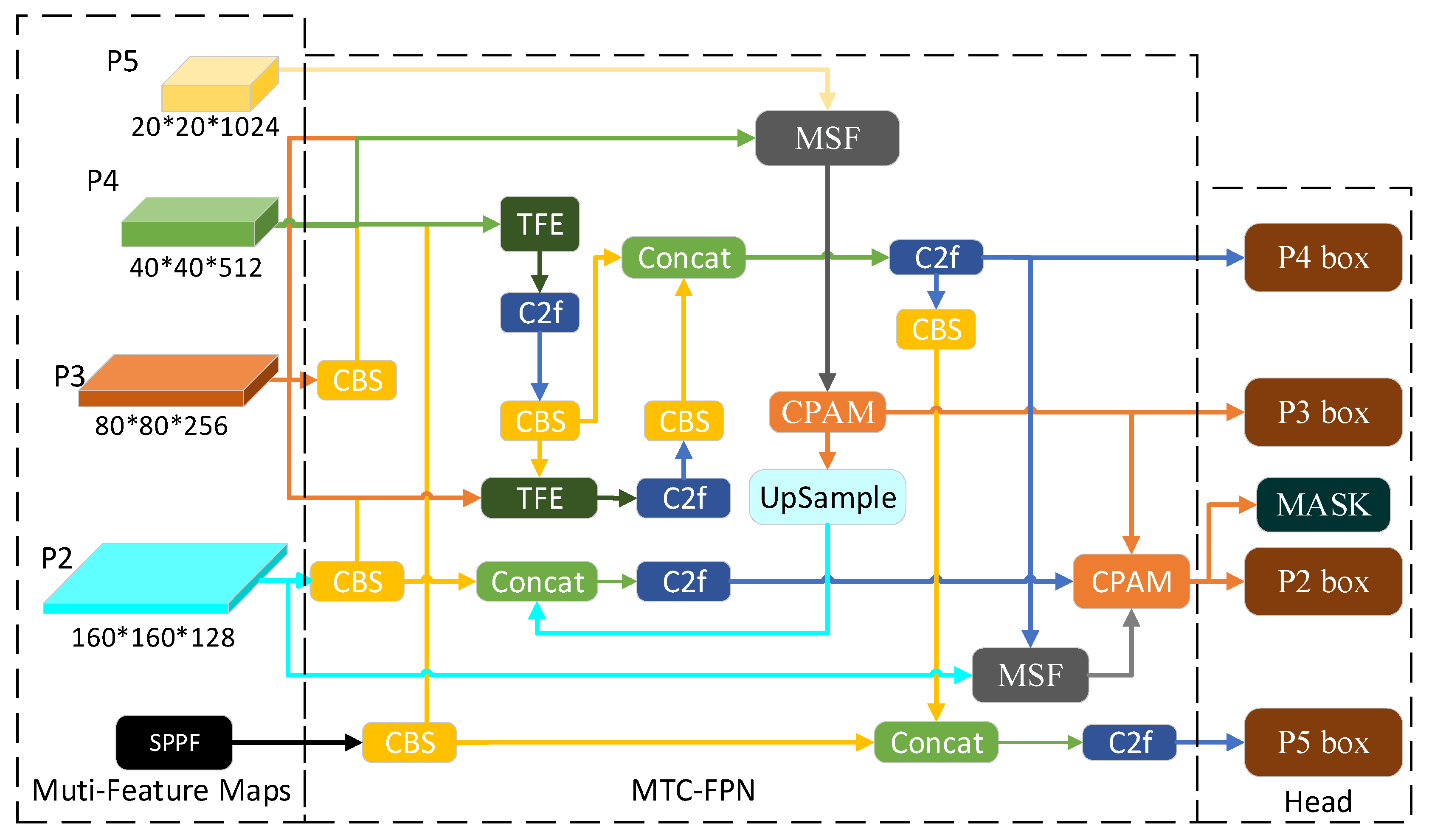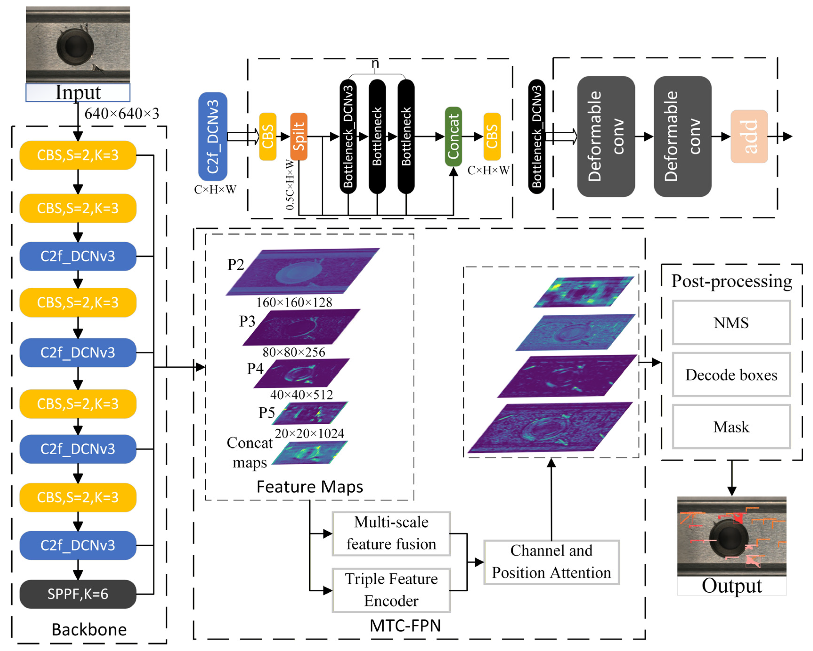 Figure 4. To enhance the ability of the YOLOv8 backbone network to extract semantic features of irregular and elongated defects, the concept of deformable convolution networks is applied to modify the C2f module in the backbone, thereby enhancing the model’s capability for geometric transformation modeling. To address the issue of small-target defect features being overlooked during feature fusion, a new feature fusion network architecture, MTC-FPN, is proposed. This architecture consists of two parts. (1) First, we have MSF (Multi-scale Feature Fusion) and TFE (triple-feature encoder) modules, where the MSF module fuses the semantic information of multiple feature maps of different sizes output by the backbone network and outputs multi-scale feature information; the TFE module captures fine local information within the feature maps. These modules enhance the feature extraction network’s ability to obtain multi-scale feature information and fine feature details. (2) The CPAM (Channel and Position Attention Mechanism) captures channel information from the feature maps output by the TFE module through a channel attention mechanism to calibrate channel weights, thereby enhancing important channel features and suppressing unimportant ones. The position attention mechanism integrates global feature information with local fine details, enhancing the model’s focus on small-target defects and minor scratches. The feature maps output by MTC-FPN are processed by the YOLOv8 segmentation decoupling head for final processing to generate guide rail surface defect classification boxes and segmentation masks. The post-processing includes (1) decode boxes, which convert the encoded positional information output by the network into actual boundary box coordinates corresponding to the original image [