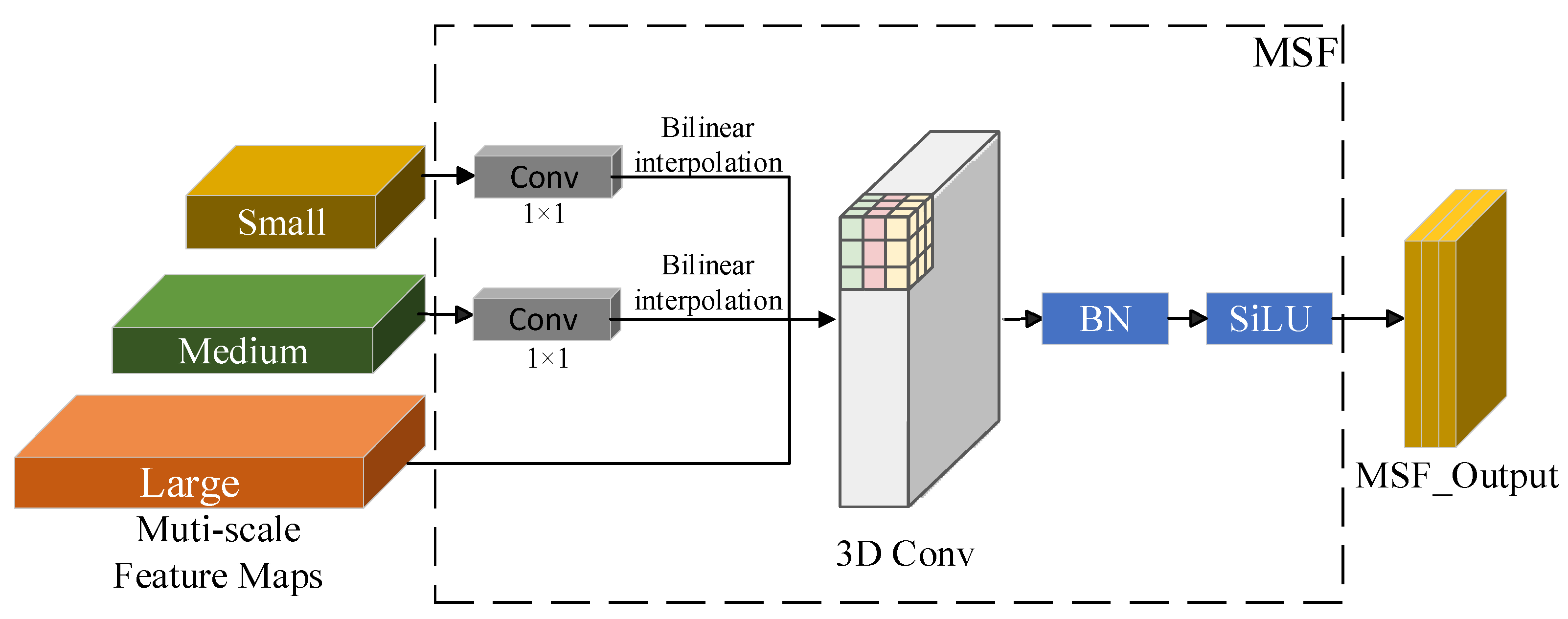 25]. In processing images of small-target defects, global and high-level semantic information is crucial for accurate identification and segmentation. The MSF module enhances the model’s ability to capture and utilize this information by fusing features from different scales, thereby improving segmentation accuracy. As illustrated in