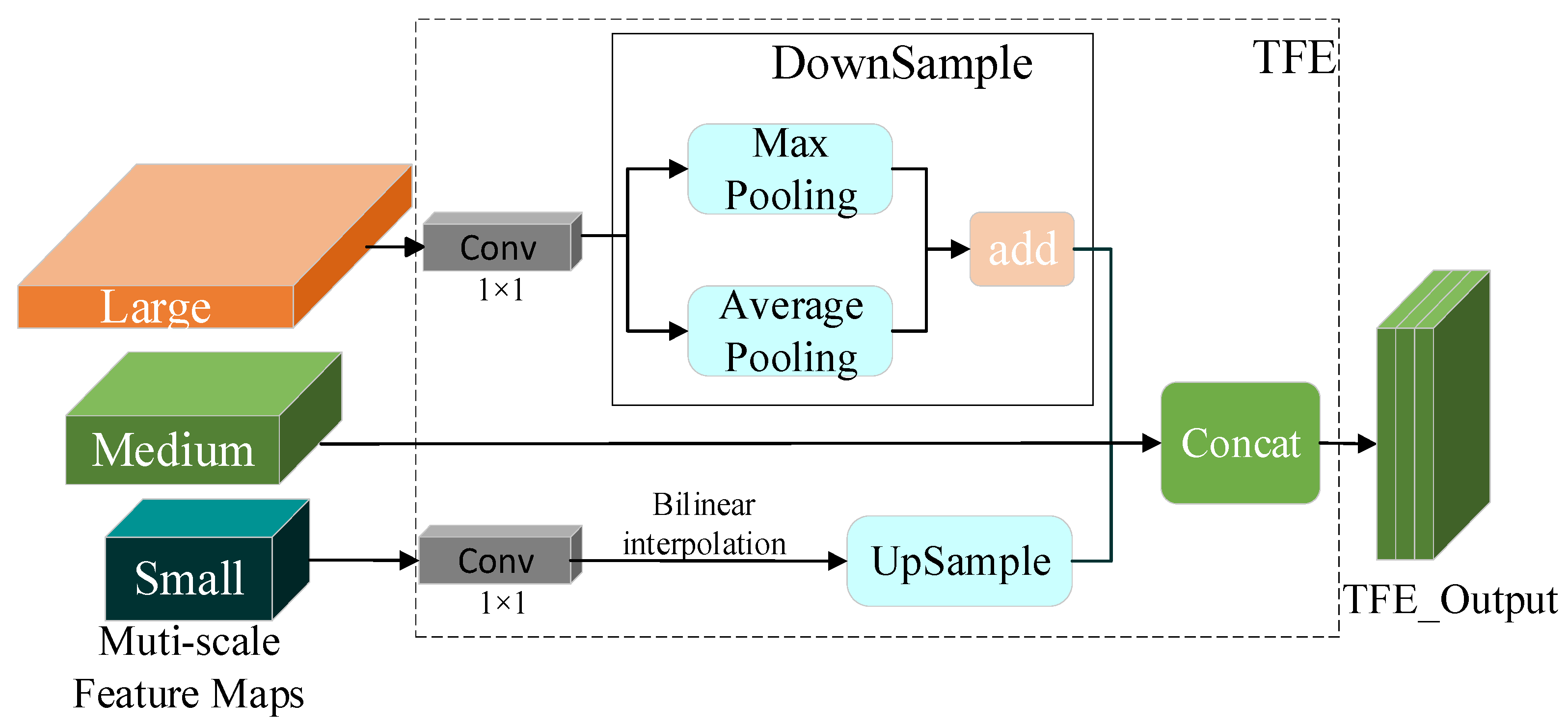 26]. This module magnifies images to compare changes in shape or appearance at different scales, focusing on capturing the local fine details of small targets. In the feature network, the TFE module divides features into three sizes: large, medium, and small. The original feature pyramid network in YOLOv8 does not perform additional processing on large-size feature maps but upsamples small-size feature maps and combines them with the previous layer’s features. The TFE module, on the other hand, utilizes the rich detail information from large-size feature maps. As shown in