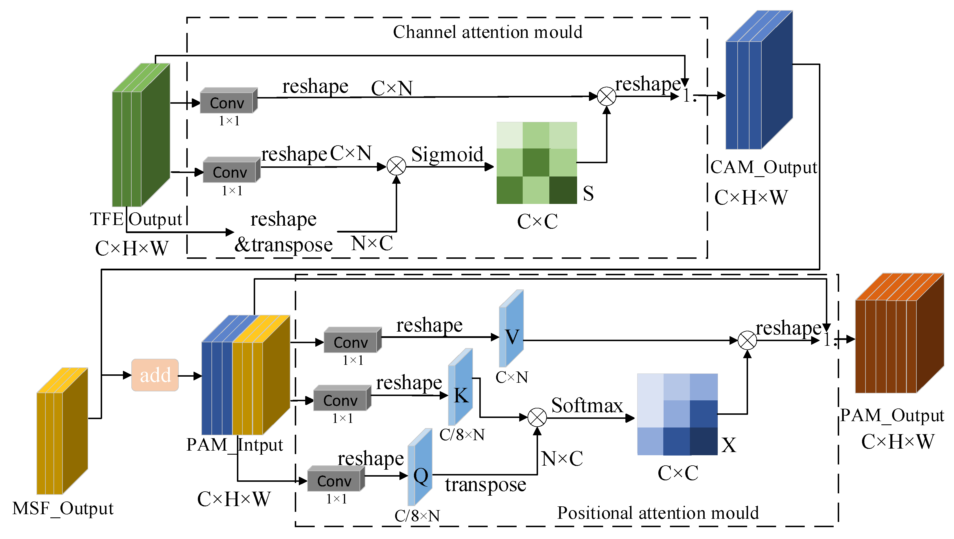 The feature map outputs from the Channel Attention Module are combined with the multi-scale feature maps from the MSF module and then fed into the Position Attention Mechanism. Initially, convolution operations are applied to the input multi-scale and detailed feature maps to generate three feature matrices: Query (Q), Key (K), and Value (V). The Q and K matrices are used to compute relationships between different positions and generate an attention map (with dimensionality reduction to decrease computational load), while the third matrix (V) retains the original number of channels to ensure consistency in the output dimensions. Subsequently, a softmax activation function calculates attention scores between different positions to adjust feature representations at each location and generates a position attention weight matrix X. In X, each element’s value represents the influence of one position on another. In the feature map, the more similar the feature representations of two positions, the greater their correlation. The calculation formula is shown in Equation (4).