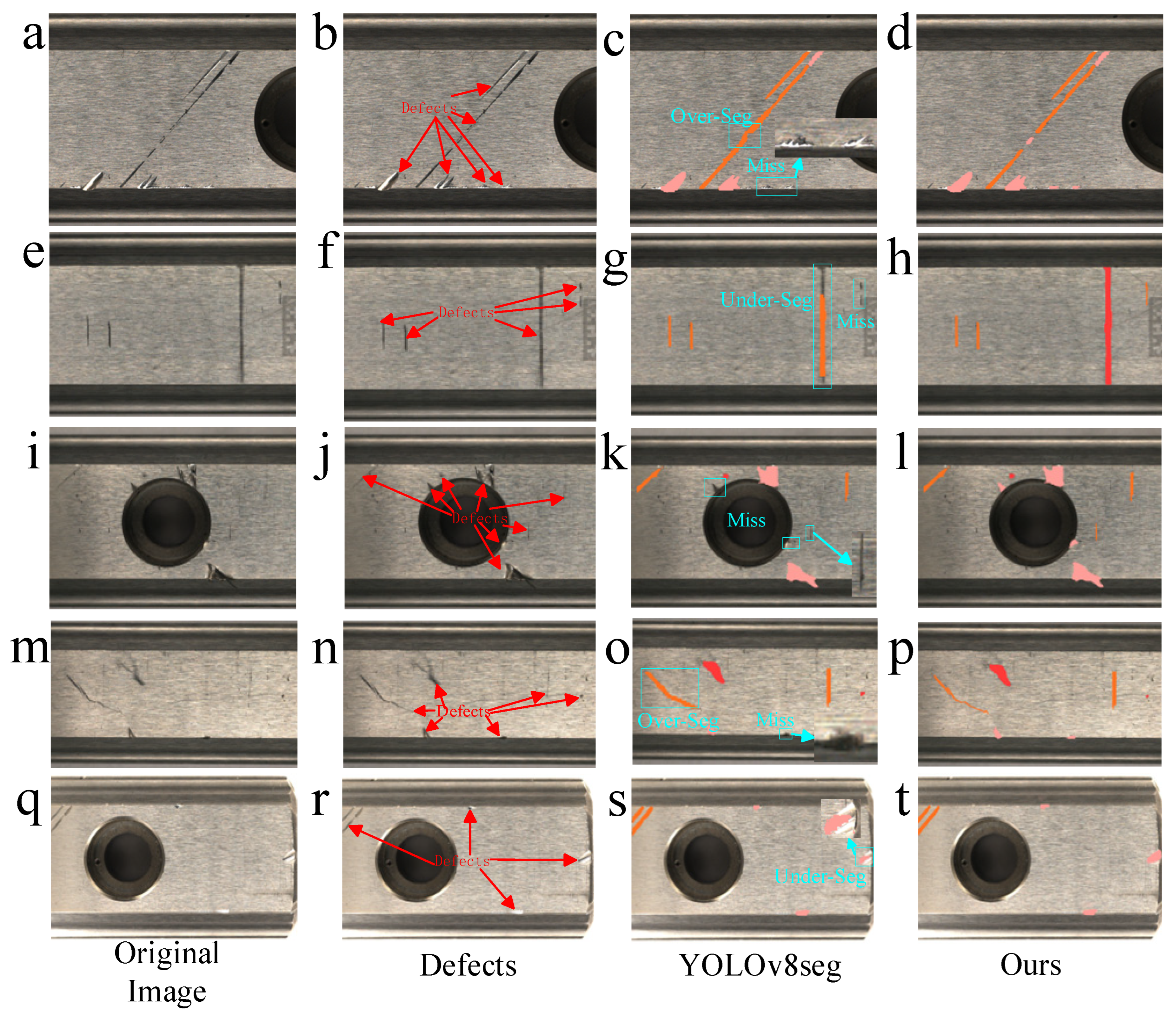 Figure 9h,k); an example of this is when two scratches on the right side of the guide rail surface are close together, resulting in the two defects being segmented as one. The second shortcoming is the segmentation precision; when the defects are elongated or irregular, the segmented defect contours are larger than the defects themselves (